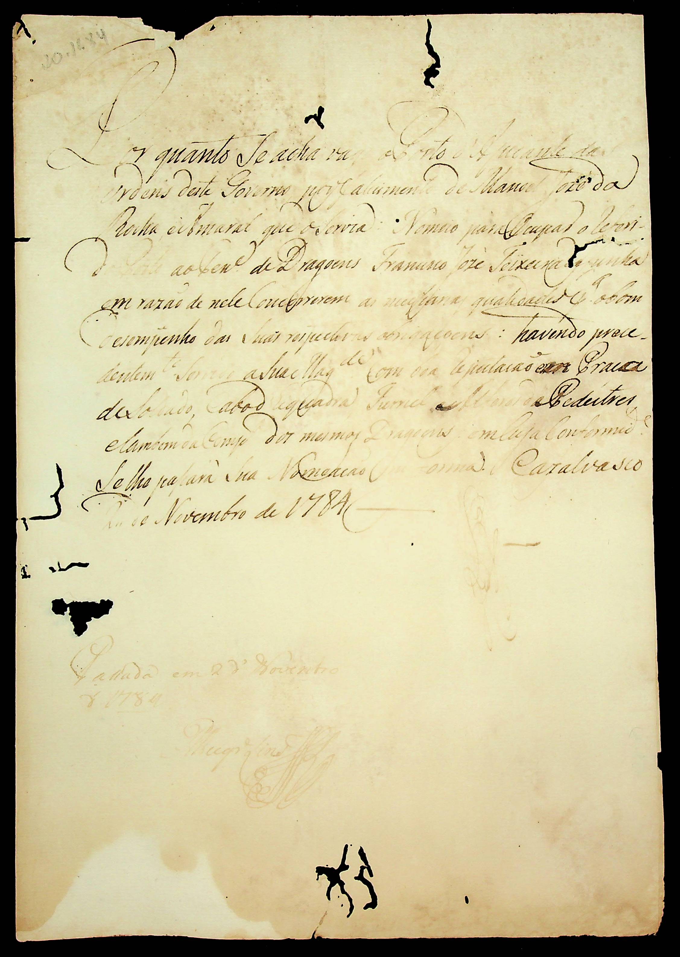 NOMEAÇÃO de Francisco José Teixeira da Cunha para ocupar o Cargo de Ajudante de Ordens do Governo, passada pelo [Governador e Capitão General da Capitania de Mato Grosso Luiz de Albuquerque de Mello Pereira e Cáceres].