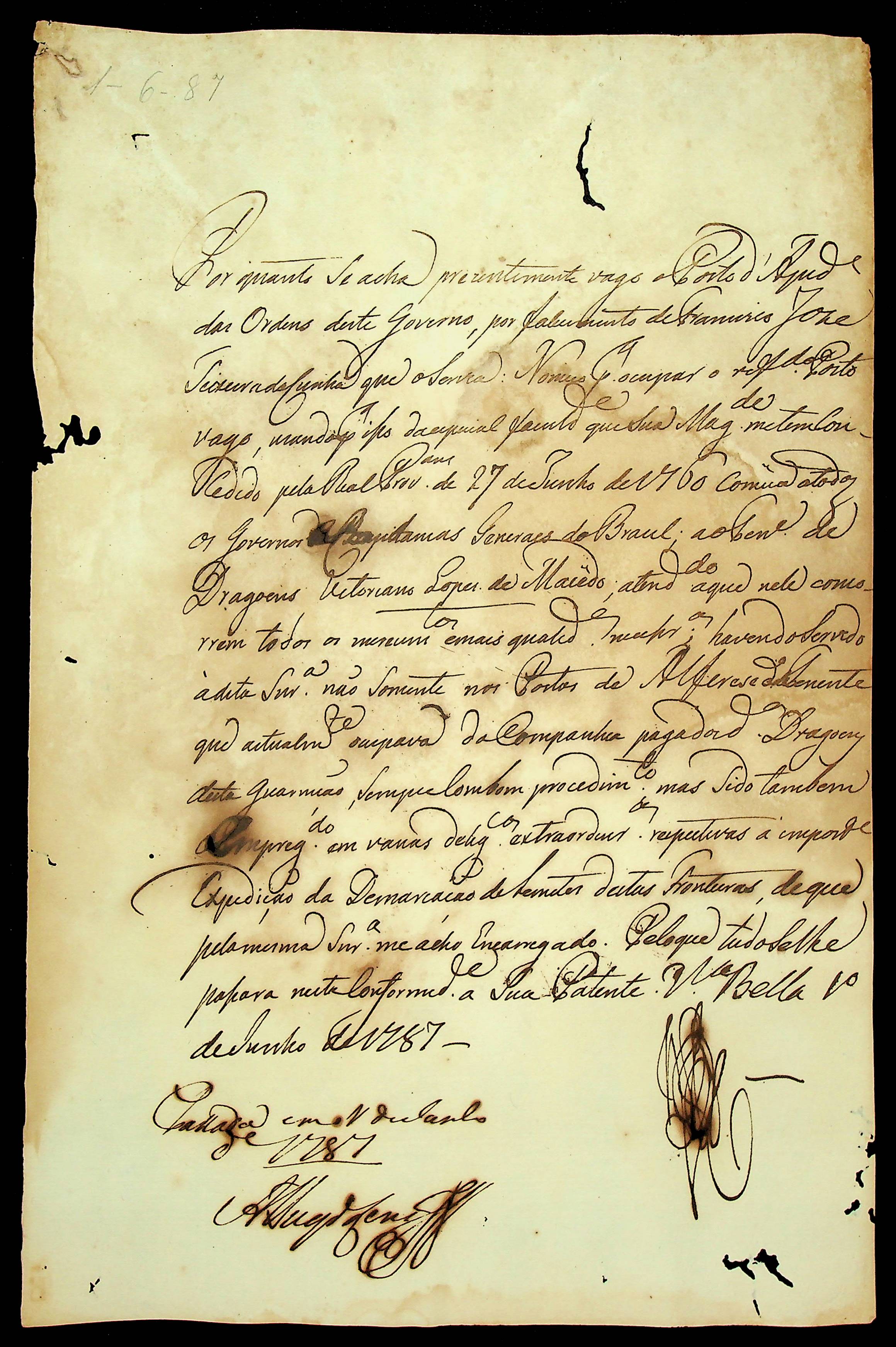 NOMEAÇÃO do Tenente de Dragões Victoriano Lopes de Macedo ao Posto de Ajudante de Ordens, passada pelo [Governador e Capitão General da Capitania de Mato Grosso Luiz de Albuquerque de Mello Pereira e Cáceres].