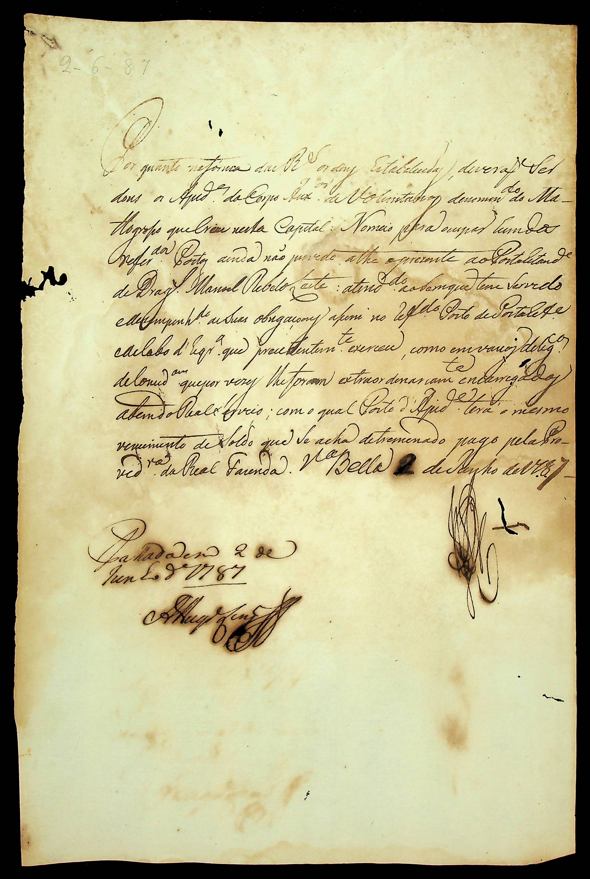 NOMEAÇÃO do Porta Estandarte de Dragões Manoel [Rabelo] Leite para ocupar um dos Postos de Ajudante do Corpo Auxiliar de Voluntários de Mato Grosso, passada pelo [Governador e Capitão General da Capitania de Mato Grosso Luiz de Albuquerque de Mello Pereira e Cáceres].