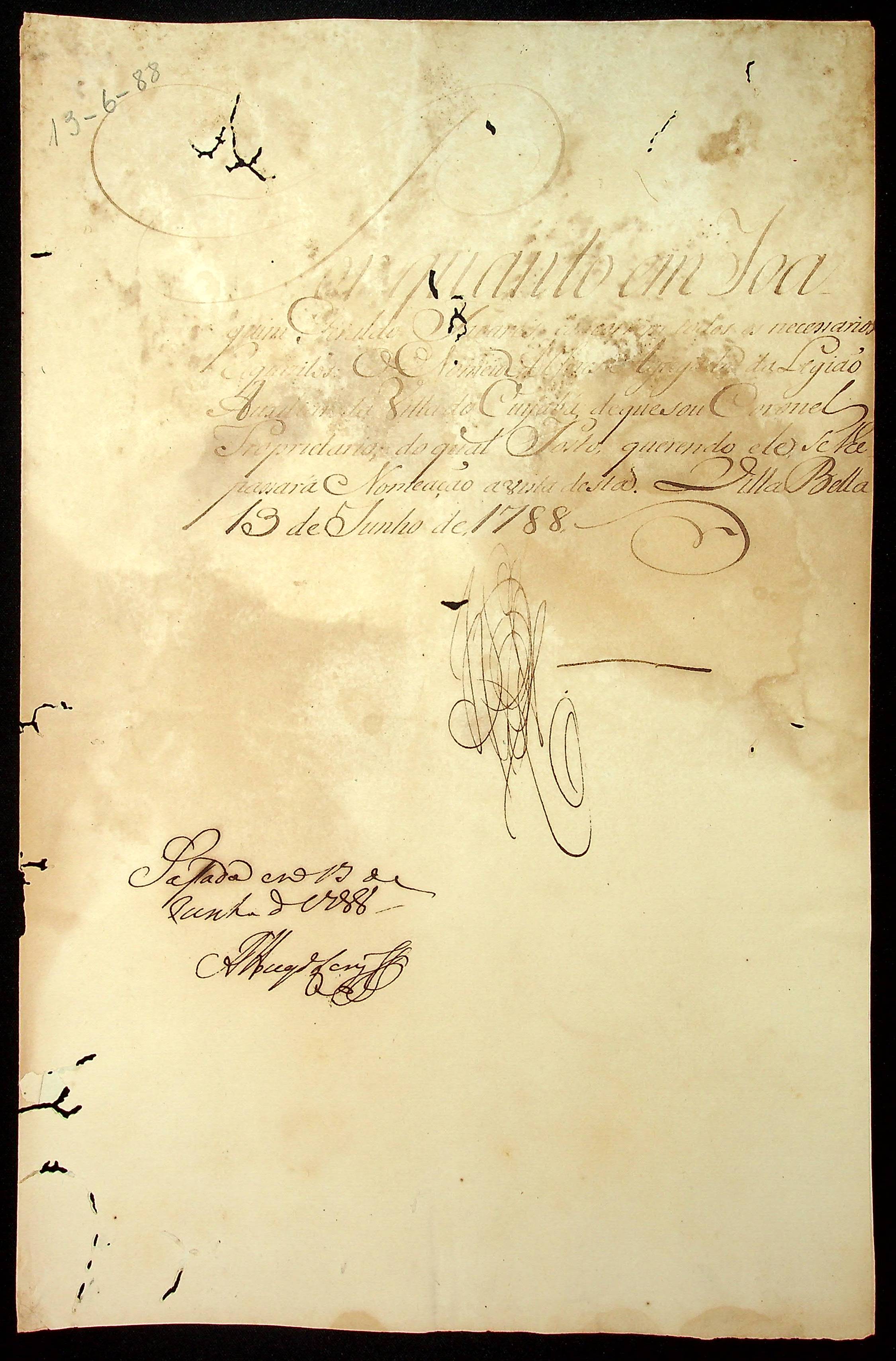 NOMEAÇÃO de Joaquim Geraldo Soares ao posto de Alferes Agregado da Legião Auxiliar da Vila do Cuiabá, passada pelo [Governador e Capitão General da Capitania de Mato Grosso Luiz de Albuquerque de Mello Pereira e Cáceres].