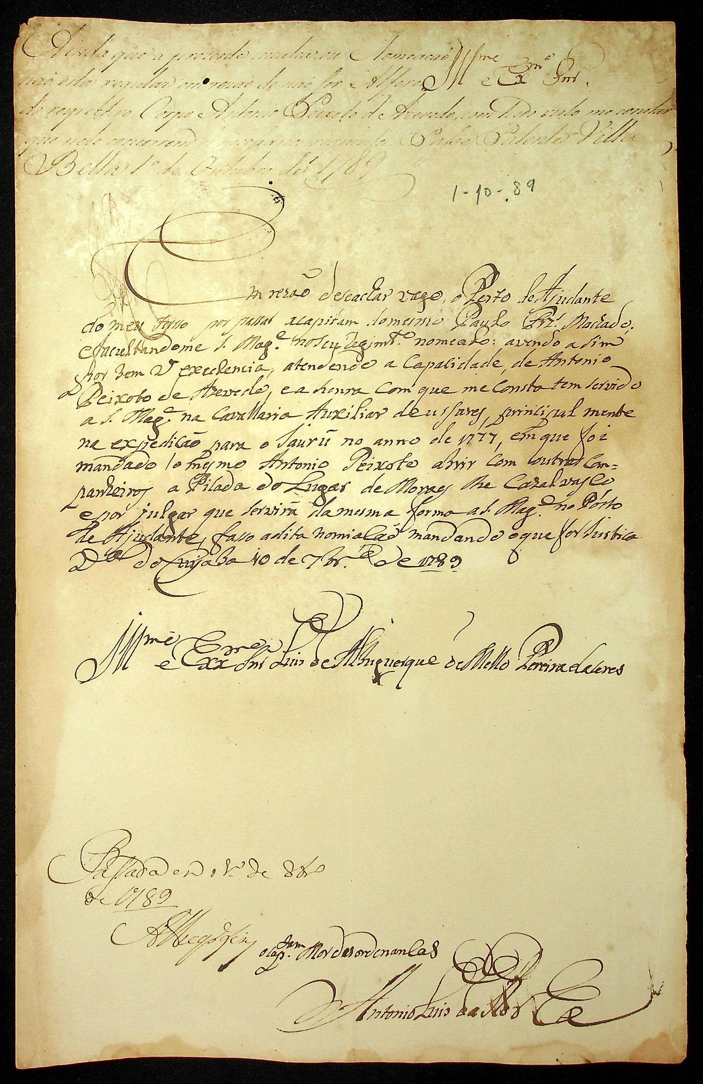 NOMEAÇÃO de Antônio Peixoto Azevedo ao cargo de Ajudante [de Ordenanças], passada pelo capitão-mor Antônio Luís da Rocha.