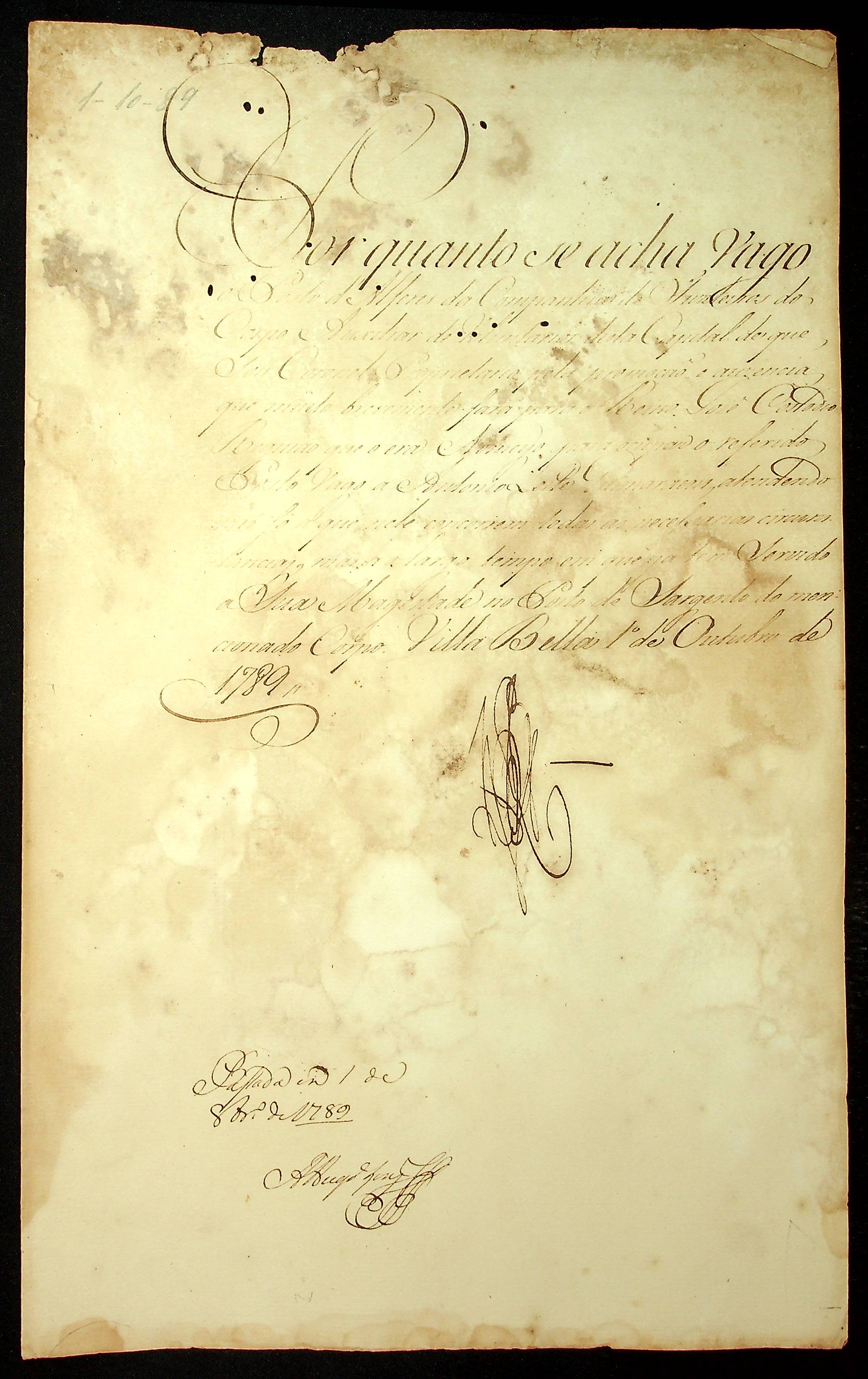 NOMEAÇÃO de Antônio Leite Guimarães ao Cargo de Alferes da Companhia de Fuzileiros do Corpo de Auxiliar de Voluntários da Vila do Cuiabá, passada pelo [Governador e Capitão General da Capitania de Mato Grosso Luiz de Albuquerque de Mello Pereira e Cáceres].
