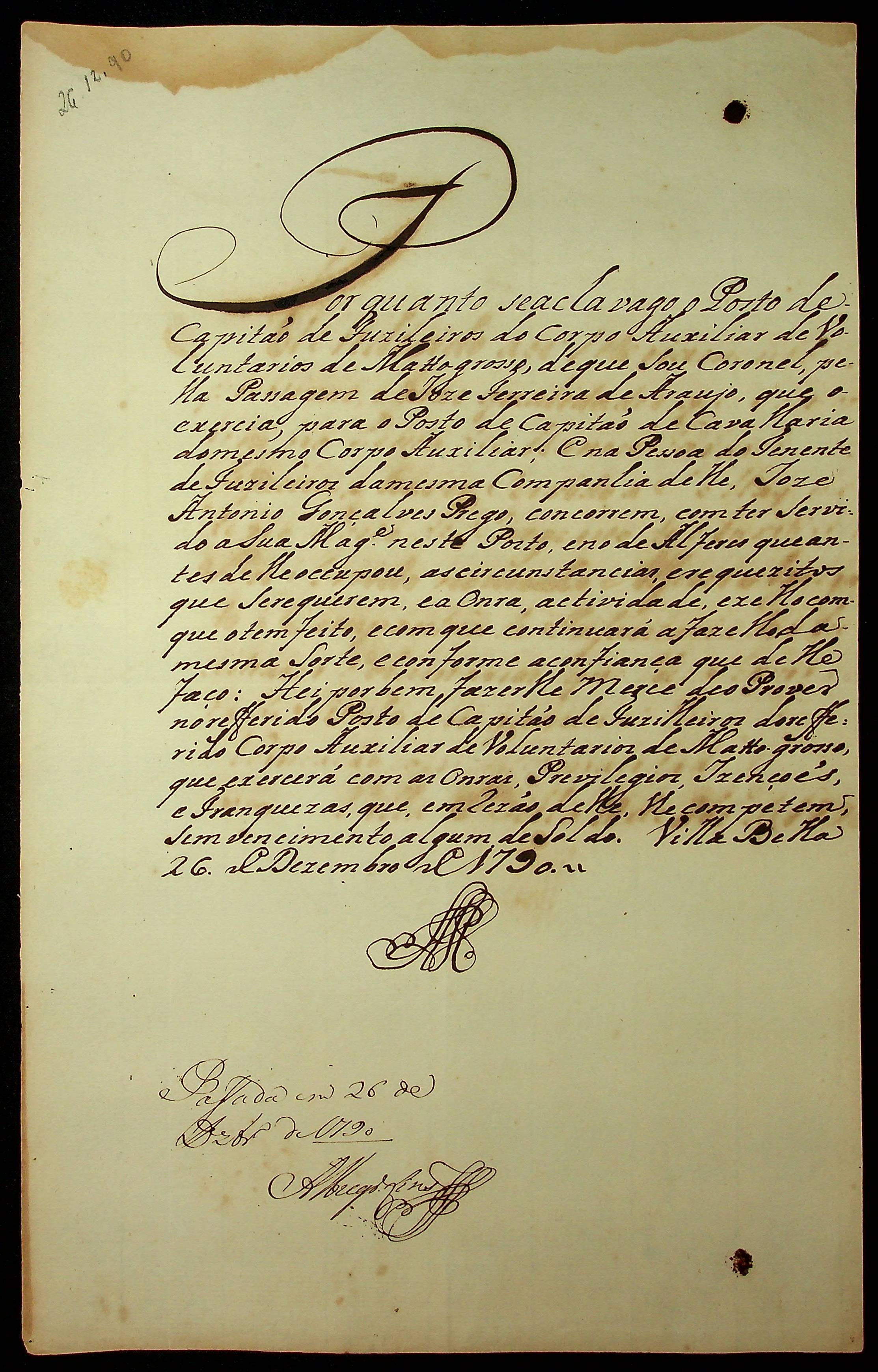 NOMEAÇÃO de José Antônio Gonçalves Prego ao posto de Capitão de Fuzileiros do Corpo de Auxiliar de Voluntário de Mato Grosso, passada pelo [Governador e Capitão General da Capitania de Mato Grosso João de Albuquerque de Mello Pereira e Cáceres].