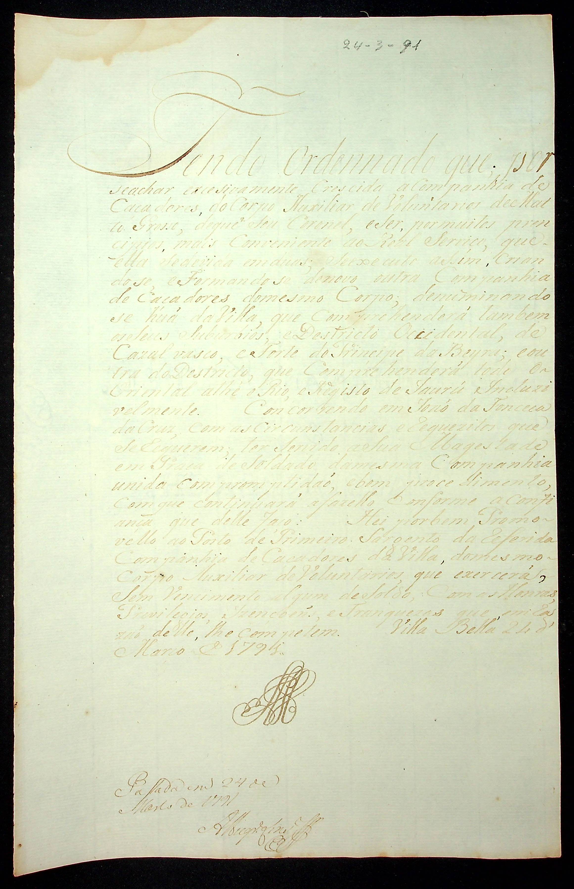 NOMEAÇÃO de João Fonseca da Cruz ao posto de 1º Sargento da Companhia de Caçadores do Corpo Auxiliar de Voluntários de Mato Grosso, passada pelo [Governador e Capitão General da Capitania de Mato Grosso João de Albuquerque de Mello Pereira e Cáceres].