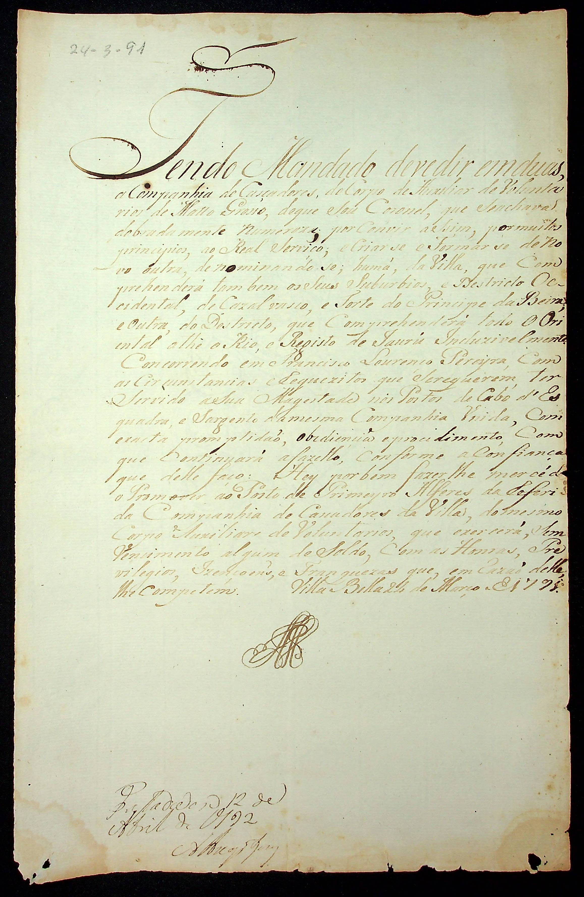 NOMEAÇÃO de Francisco Lourenço Pereira ao posto de primeiro Alferes da Companhia de Caçadores do Corpo Auxiliar de Voluntários de Mato Grosso, passada pelo [Governador e Capitão General da Capitania de Mato Grosso João de Albuquerque de Mello Pereira e Cáceres].