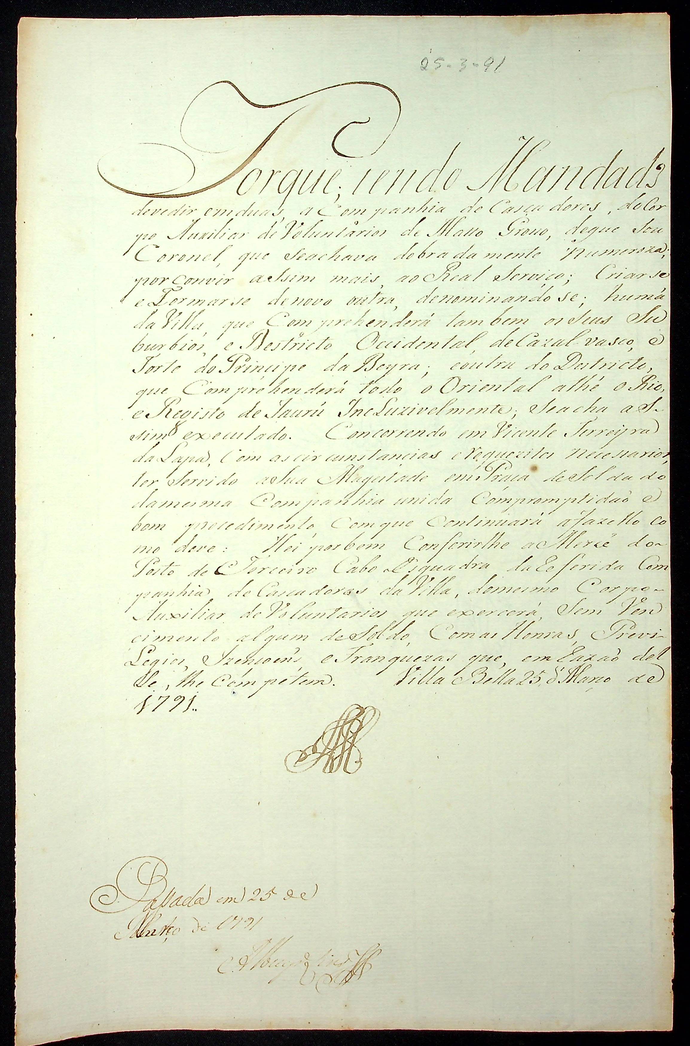 NOMEAÇÃO de Vicente Ferreira da Lapa ao posto de terceiro Cabo de Esquadra da Companhia de Caçadores do Corpo Auxiliar de Voluntários de Mato Grosso, passada pelo [Governador e Capitão General da Capitania de Mato Grosso João de Albuquerque de Mello Pereira e Cáceres].
