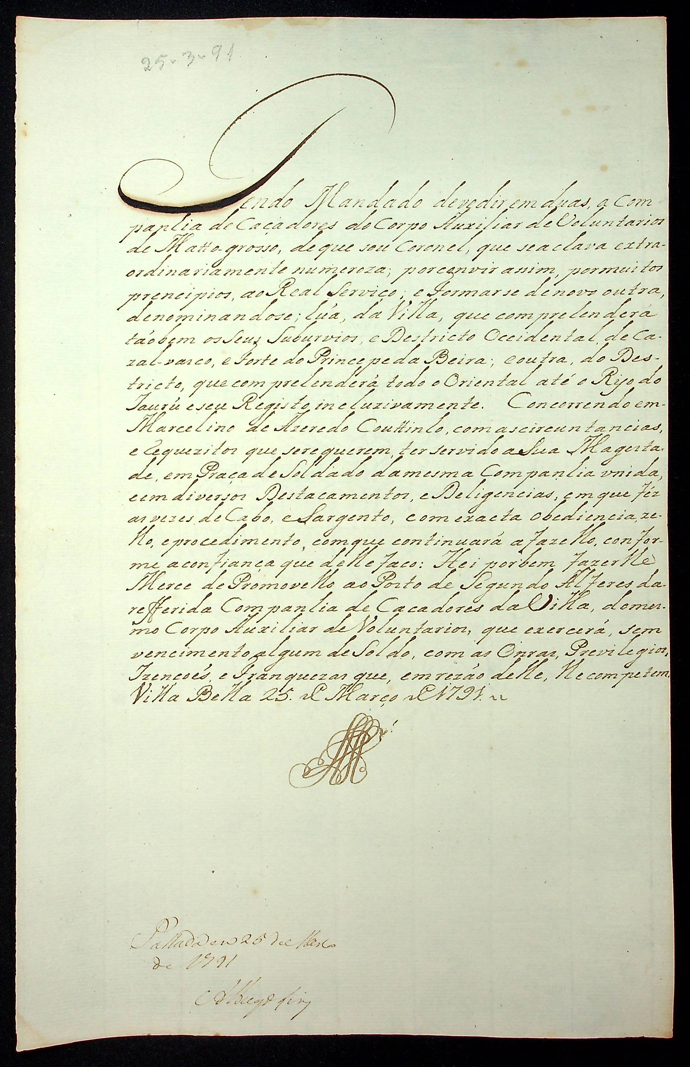 NOMEAÇÃO de Marcelino de Azevedo Coutinho ao posto de Segundo Alferes da Companhia de Caçadores do Corpo Auxiliar de Voluntários de Mato Grosso, passada pelo [Governador e Capitão General da Capitania de Mato Grosso João de Albuquerque de Mello Pereira e Cáceres].
