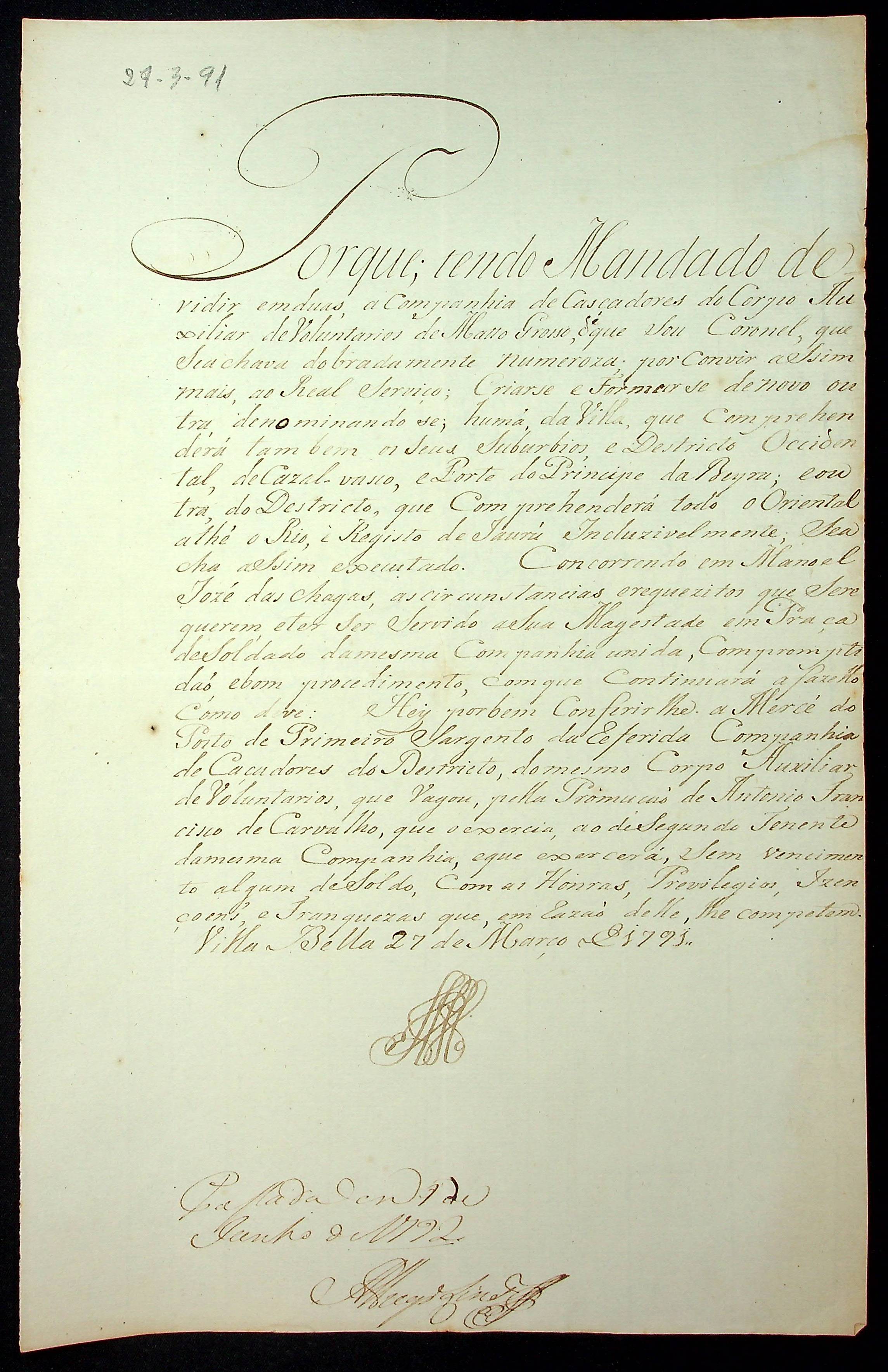 NOMEAÇÃO de Manoel José da Chagas ao posto de 1º Sargento da Companhia de Caçadores do Corpo Auxiliar de Voluntários de Mato Grosso, passada pelo [Governador e Capitão General da Capitania de Mato Grosso João de Albuquerque de Mello Pereira e Cáceres].