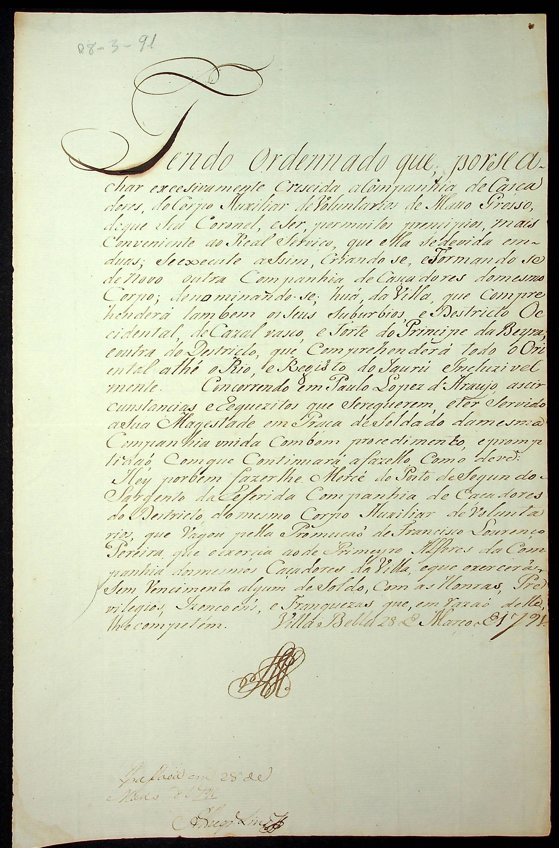 NOMEAÇÃO de Paulo Lopes de Araújo ao posto de Sargento da Companhia de Caçadores do Corpo Auxiliar de Voluntários de Mato Grosso, passada pelo [Governador e Capitão General da Capitania de Mato Grosso João de Albuquerque de Mello Pereira e Cáceres].