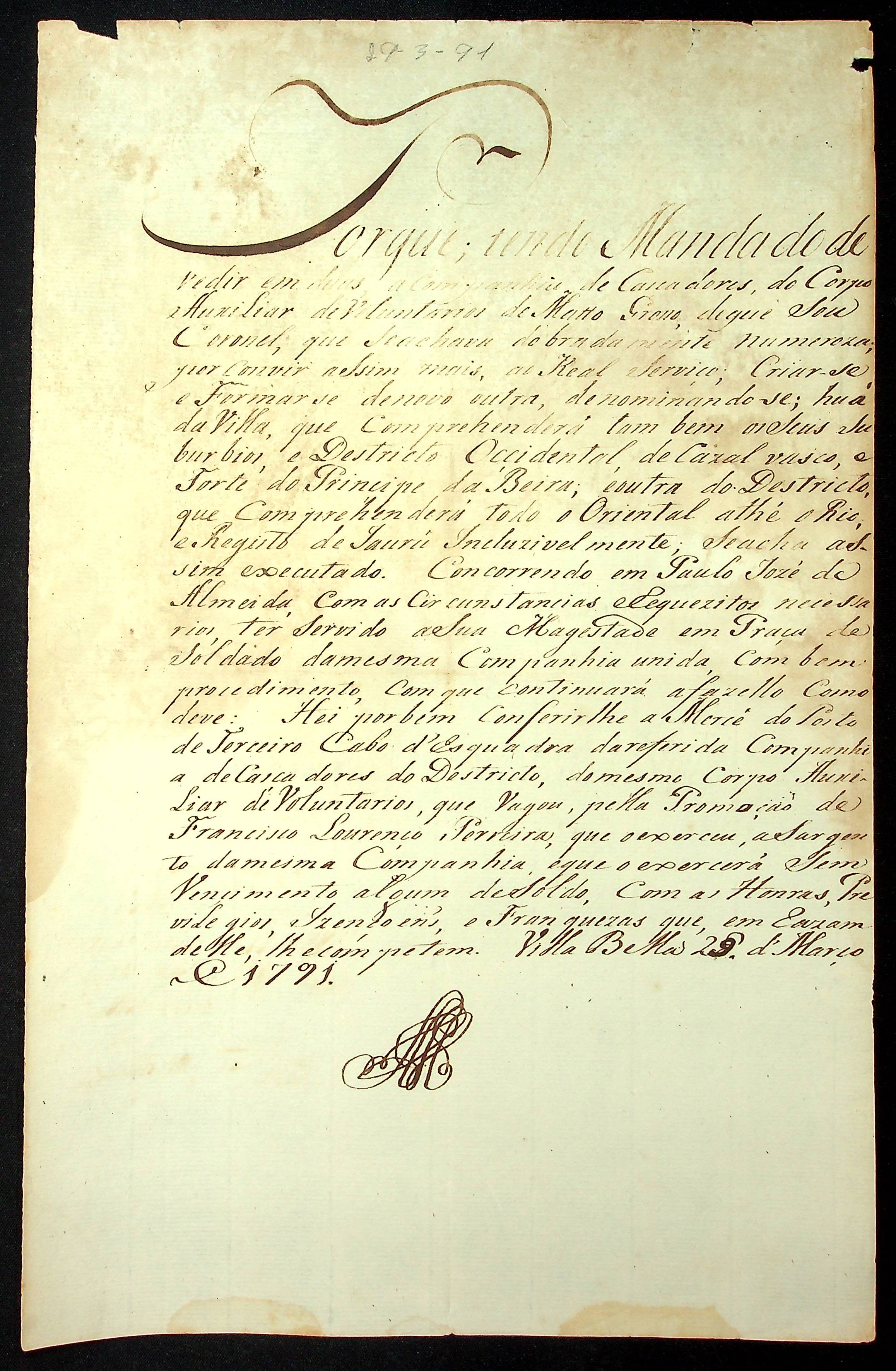NOMEAÇÃO de Paulo José de Almeida ao posto de Terceiro Cabo de Esquadra da Companhia de Caçadores do Corpo Auxiliar de Voluntários de Mato Grosso, passada pelo [Governador e Capitão General da Capitania de Mato Grosso João de Albuquerque de Mello Pereira e Cáceres].