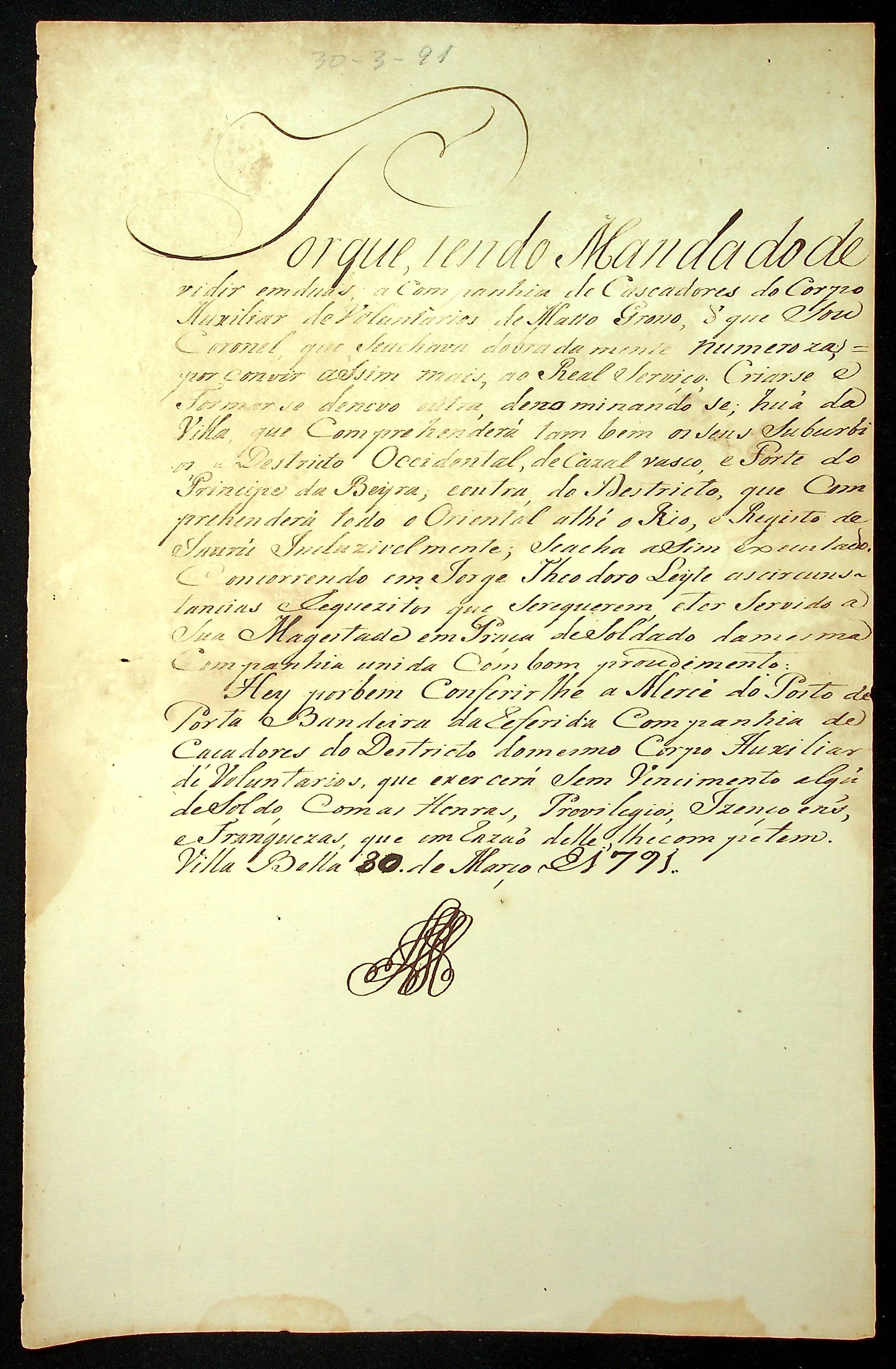NOMEAÇÃO de Jorge Theodoro Leite ao posto de Porta Bandeira da Companhia de Caçadores do Corpo Auxiliar de Voluntários de Mato Grosso, passada pelo [Governador e Capitão General da Capitania de Mato Grosso João de Albuquerque de Mello Pereira e Cáceres].
