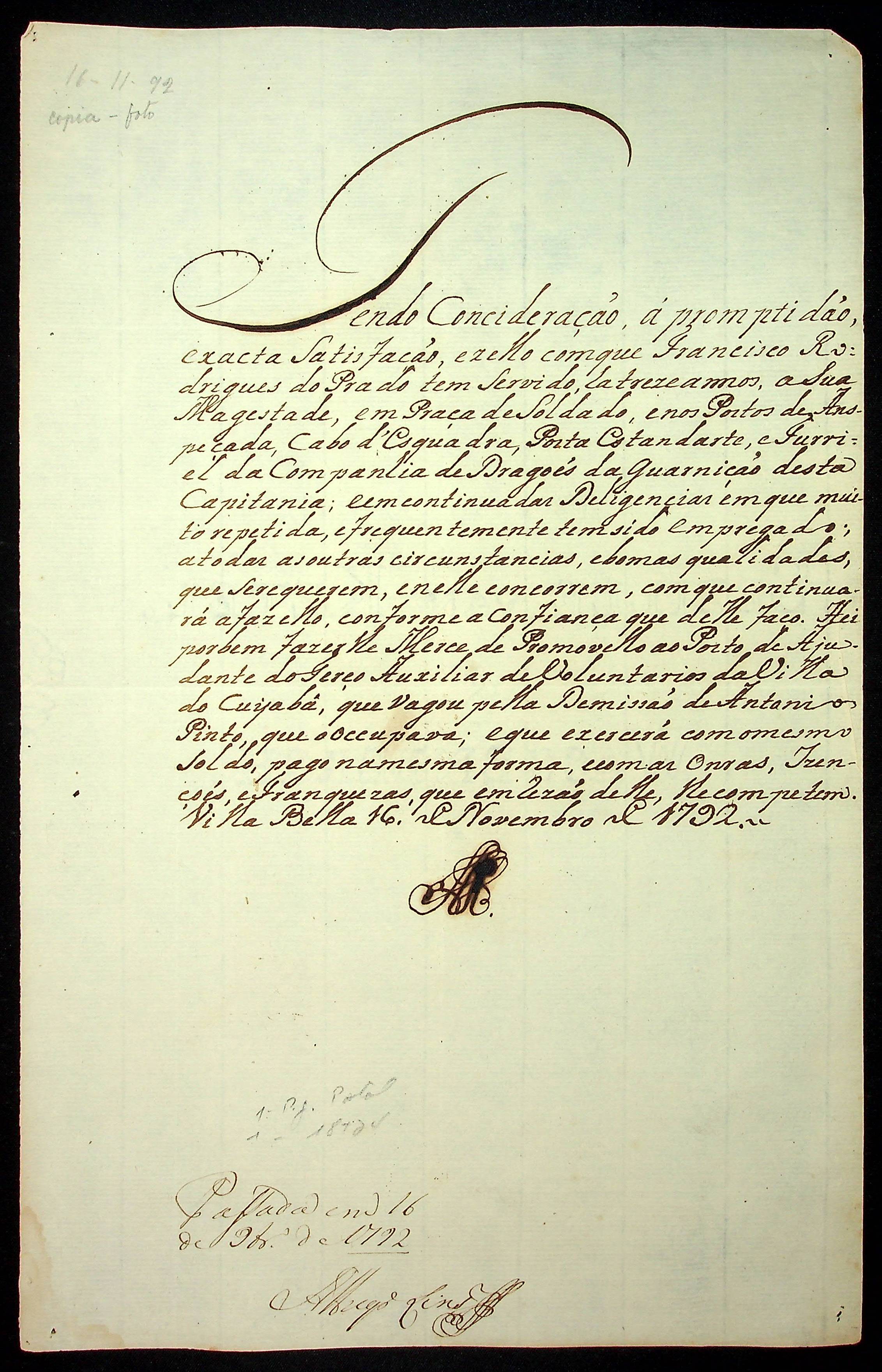 NOMEAÇÃO de Francisco Rodrigues do Prado ao posto de ajudante do Terço Auxiliar de voluntários da Vila do Cuiabá, passada pelo [Governador e Capitão-General da Capitania de Mato Grosso João de Albuquerque de Mello Pereira e Cáceres].
