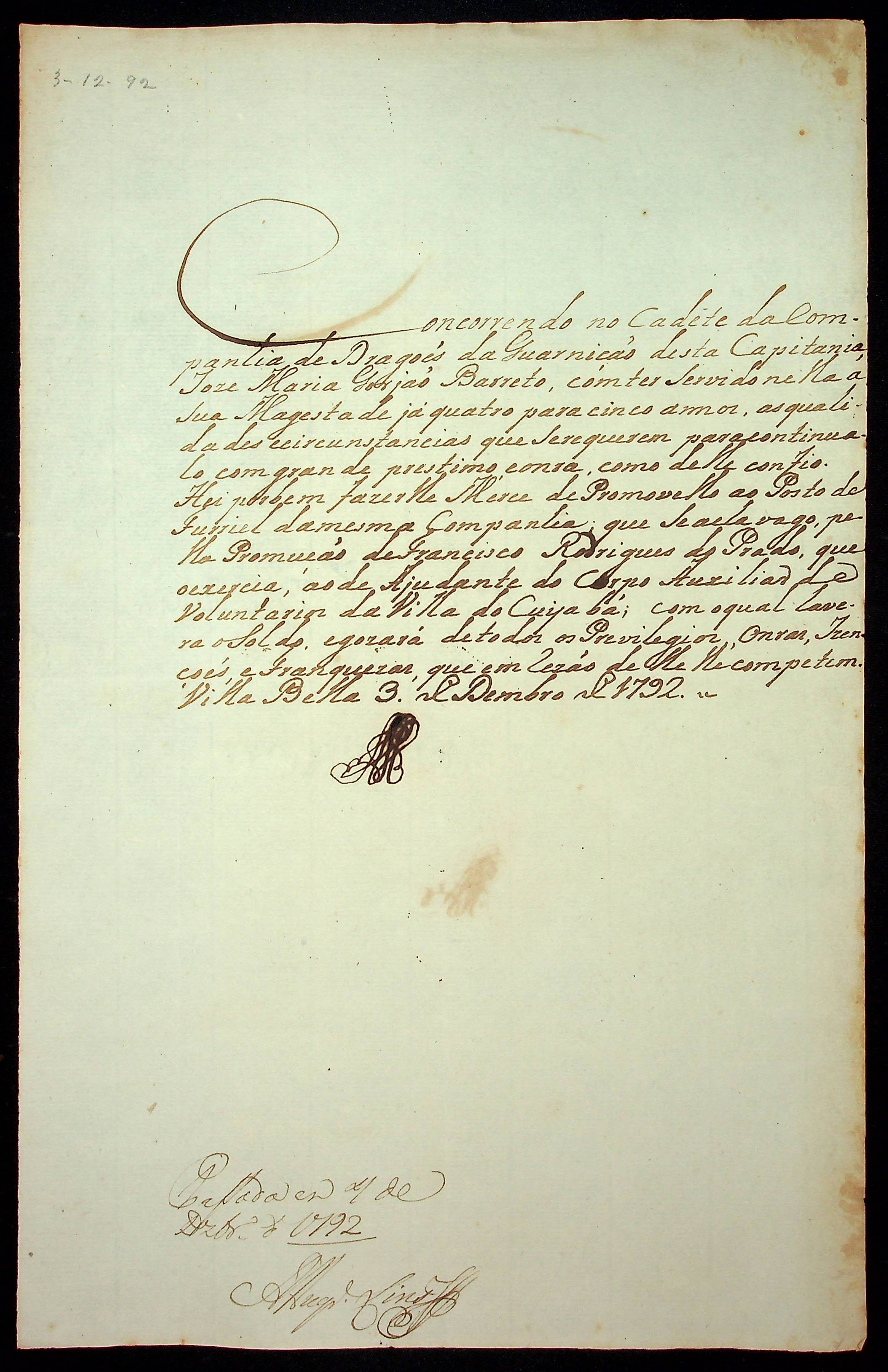 NOMEAÇÃO de José Maria Gorjão Barreto ao posto de Furriel da Companhia de Dragões, passada pelo [Governador e Capitão-General da Capitania de Mato Grosso João de Albuquerque de Mello Pereira e Cáceres].