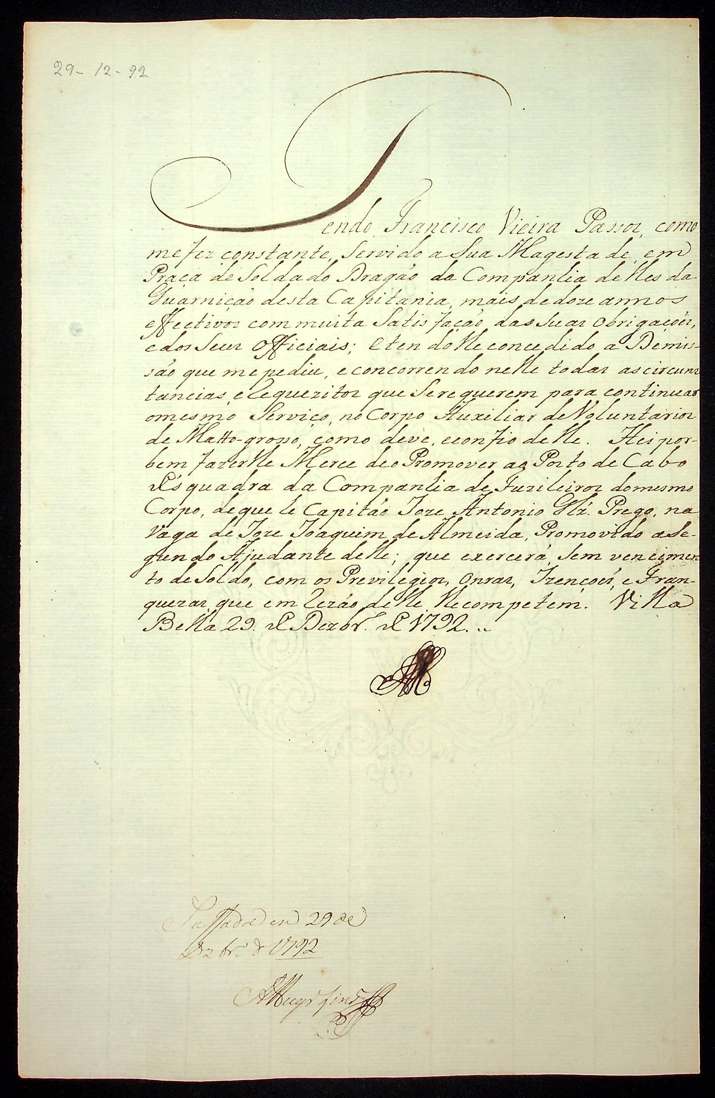 NOMEAÇÃO de Francisco Vieira Passos ao posto de Cabo de Esquadra da Companhia de Fuzileiros do Corpo Auxiliar de Voluntários de Mato Grosso, passada pelo [Governador e Capitão-General da Capitania de Mato Grosso João de Albuquerque de Mello Pereira e Cáceres].