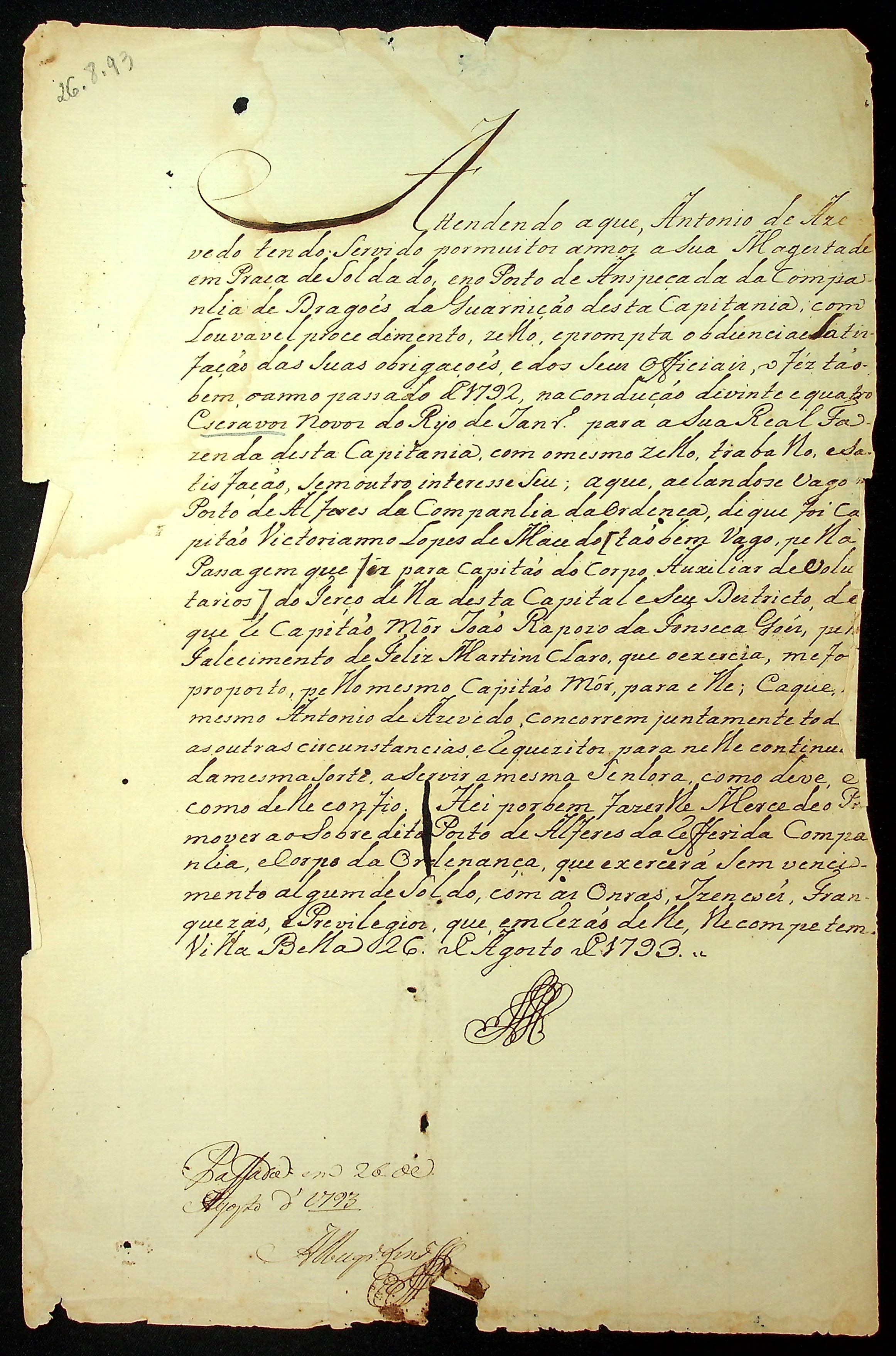 NOMEAÇÃO de Antônio de Azevedo ao posto de Alferes da Companhia de Ordenança Auxiliar de Voluntários de Mato Grosso, passada pelo [Governador e Capitão General da Capitania de Mato Grosso João de Albuquerque de Mello Pereira e Cáceres].