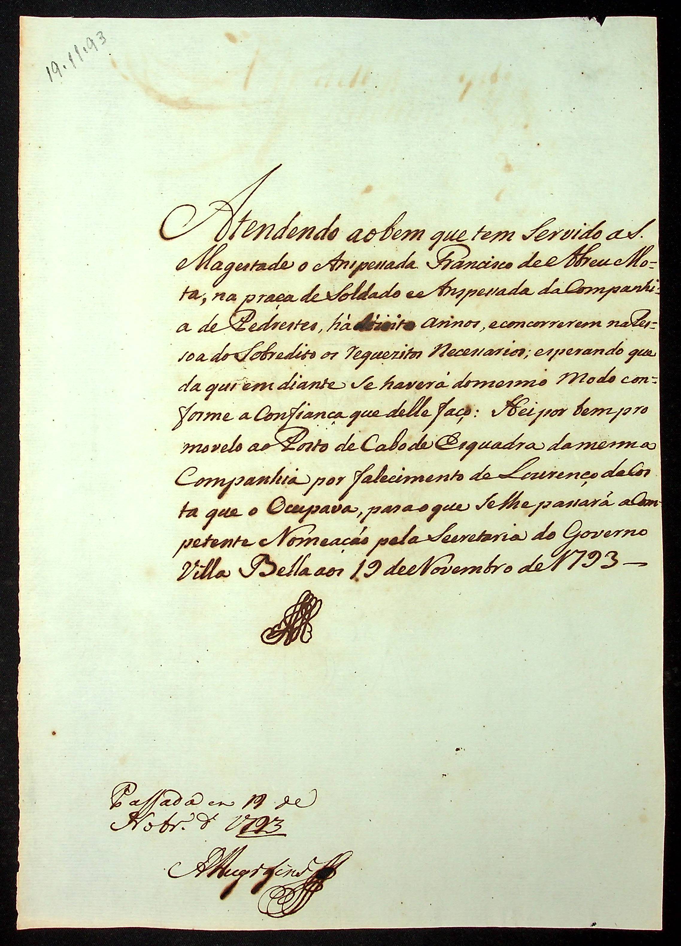 NOMEAÇÃO de Francisco de Abreu Mota no posto de Cabo Esquadra da Companhia de Pedestre, passada pelo [Governador e Capitão General da Capitania de Mato Grosso João de Albuquerque de Mello Pereira e Cáceres].