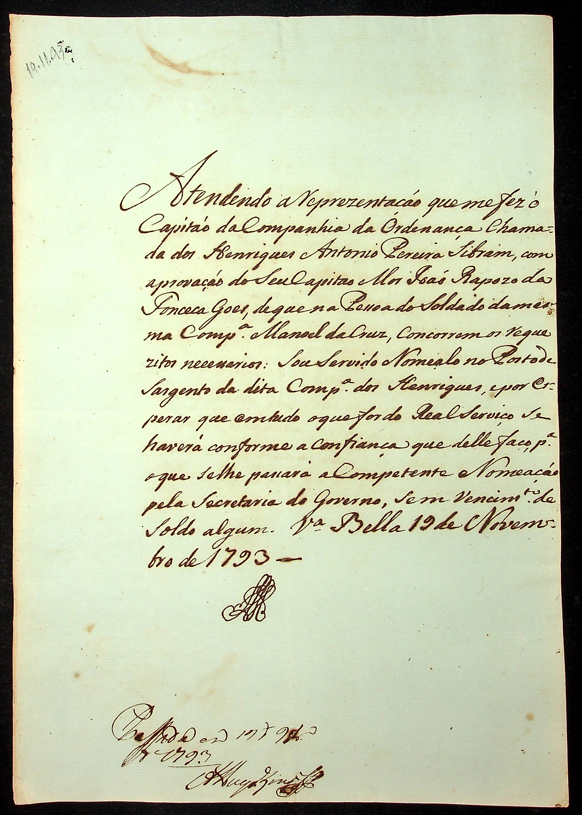 NOMEAÇÃO Manoel da Cruz no posto de Sargento da Companhia dos Henriques, passada pelo [Governador e Capitão General da Capitania de Mato Grosso João de Albuquerque de Mello Pereira e Cáceres].