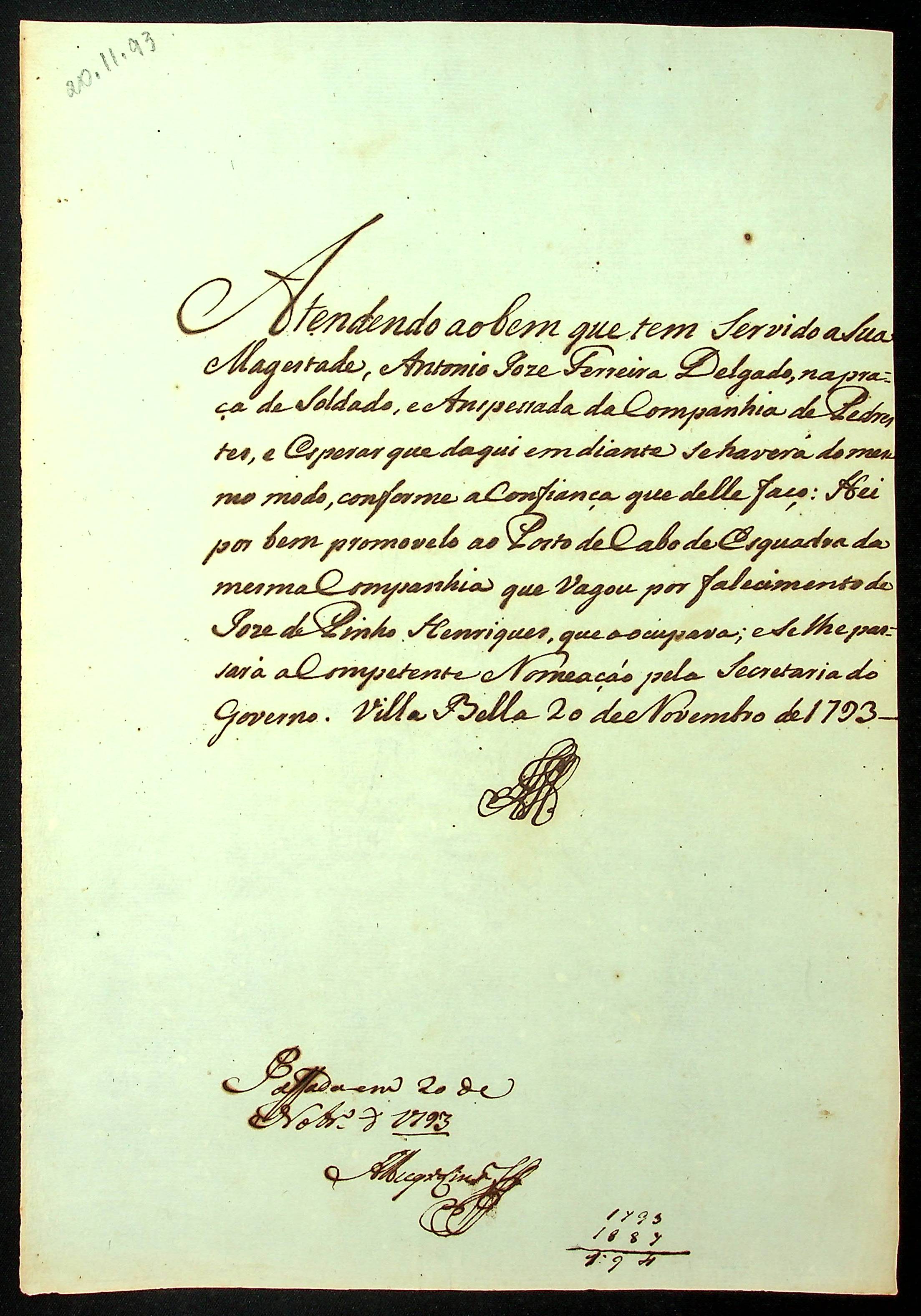 NOMEAÇÃO de Antônio José Ferreira Delgado, para o posto de Cabo de Esquadra dos Pedestres, passada pelo [Governador e Capitão General da Capitania de Mato Grosso João de Albuquerque de Mello Pereira e Cáceres].