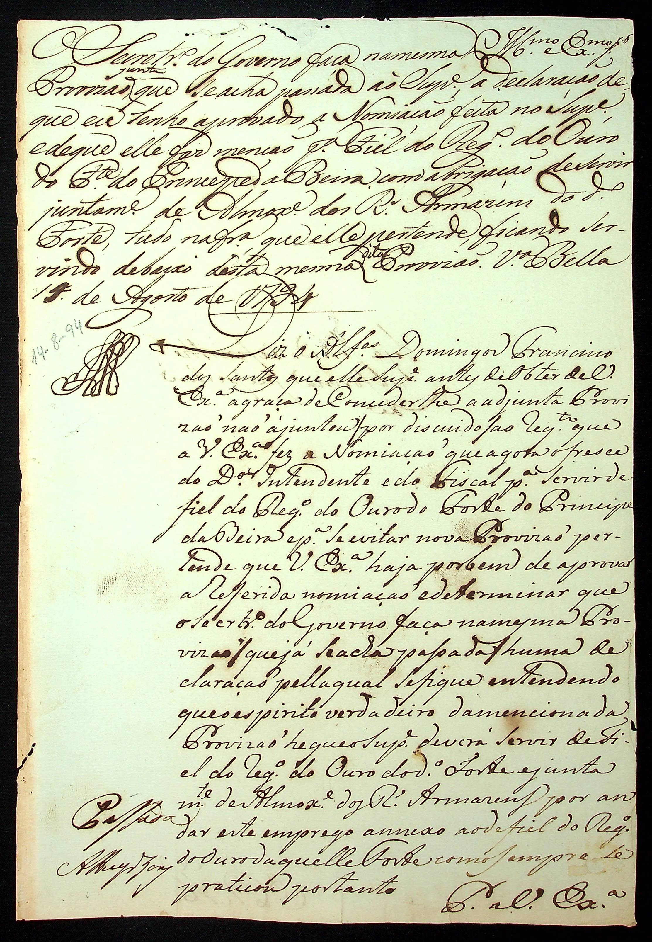 NOMEAÇÃO do Alferes Domingos Francisco dos Santos ao cargo de Fiel do Registro do Forte Príncipe da Beira, passa pelo Provedor da Real Fazenda e Intendência do Ouro da Real Casa de Fundição Luiz Thomaz Navarros de Campos.
