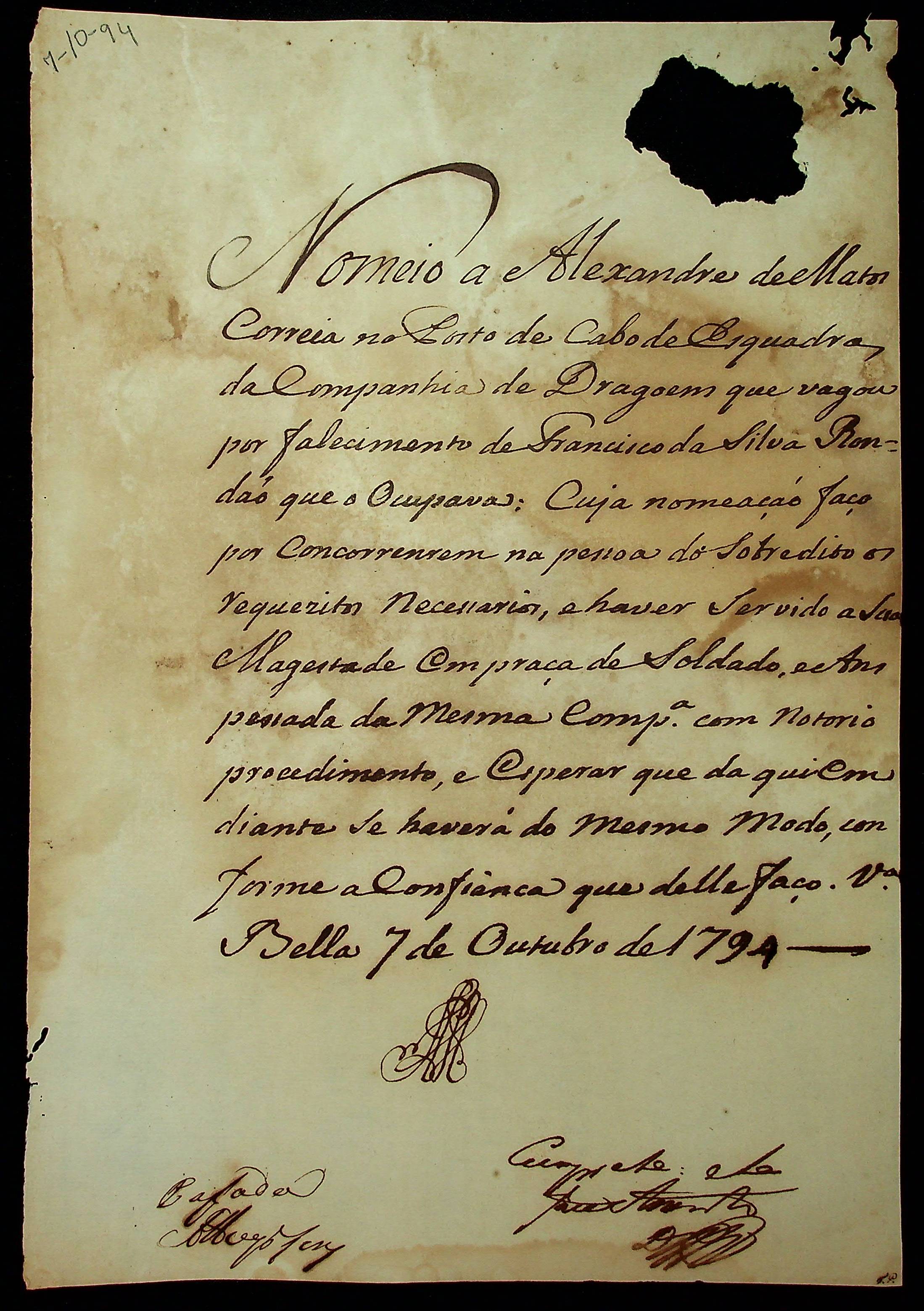 NOMEAÇÃO de Alexandre de Matos Corrêa ao posto de Cabo de Esquadra da Companhia de Dragões, passada pelo [Governador e Capitão General da Capitania de Mato Grosso João de Albuquerque de Mello Pereira e Cáceres].