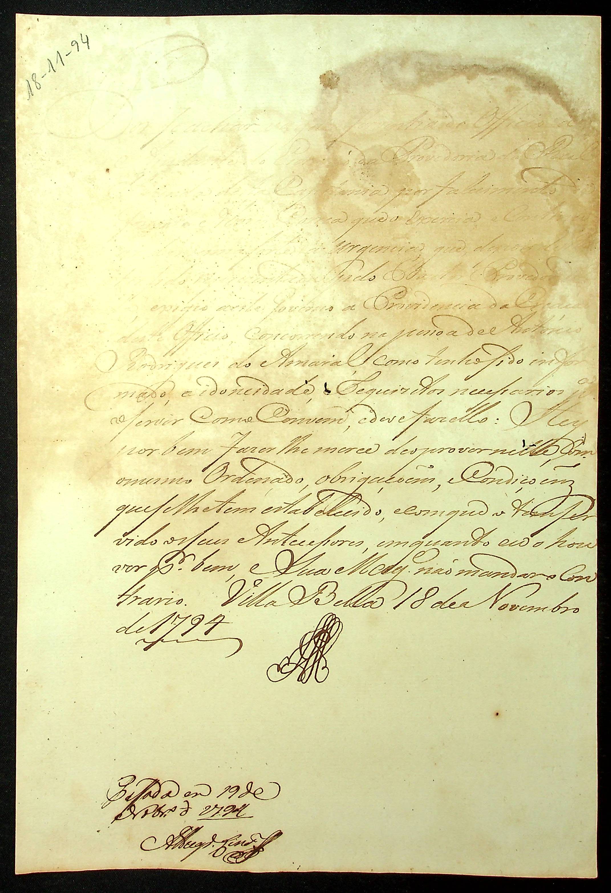 NOMEAÇÃO de Antônio Rodrigues do Amaral ao Cargo de Ajudante do Escrivão da Provedoria da Real Fazenda, passada pelo [Governador e Capitão General da Capitania de Mato Grosso João de Albuquerque de Mello Pereira e Cáceres].