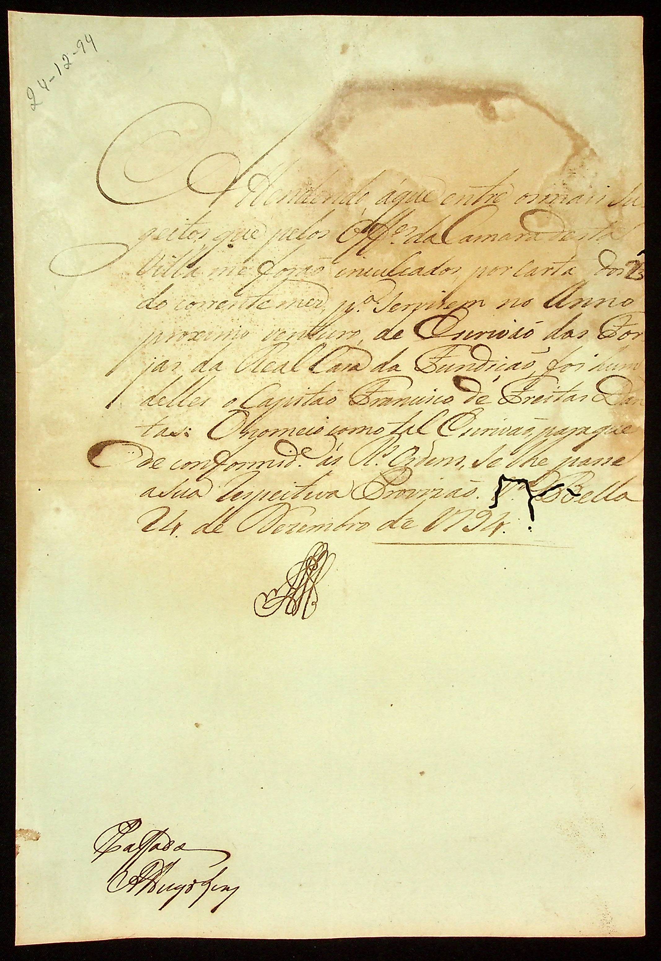 NOMEAÇÃO do Capitão Francisco de Freitas Dantas ao posto de Escrivão das Forjas da Real Casa de Fundição, passada pelo [Governador e Capitão General da Capitania de Mato Grosso João de Albuquerque de Mello Pereira e Cáceres].