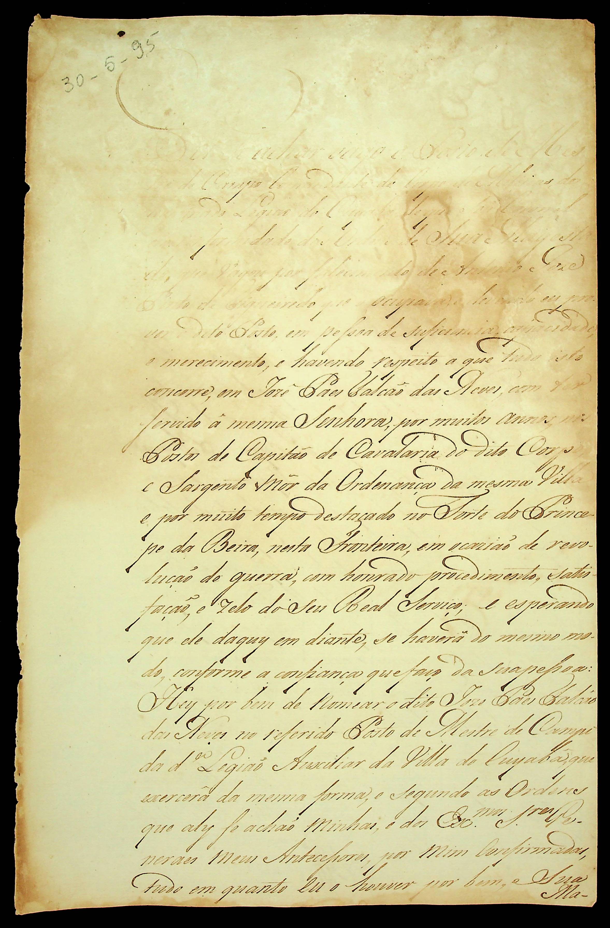 NOMEAÇÃO de José Paes Falcão das Neves para o posto de Mestre de Campo da Vila do Cuiabá, passada pelo [Governador e Capitão General da Capitania de Mato Grosso João de Albuquerque de Mello Pereira e Cáceres].