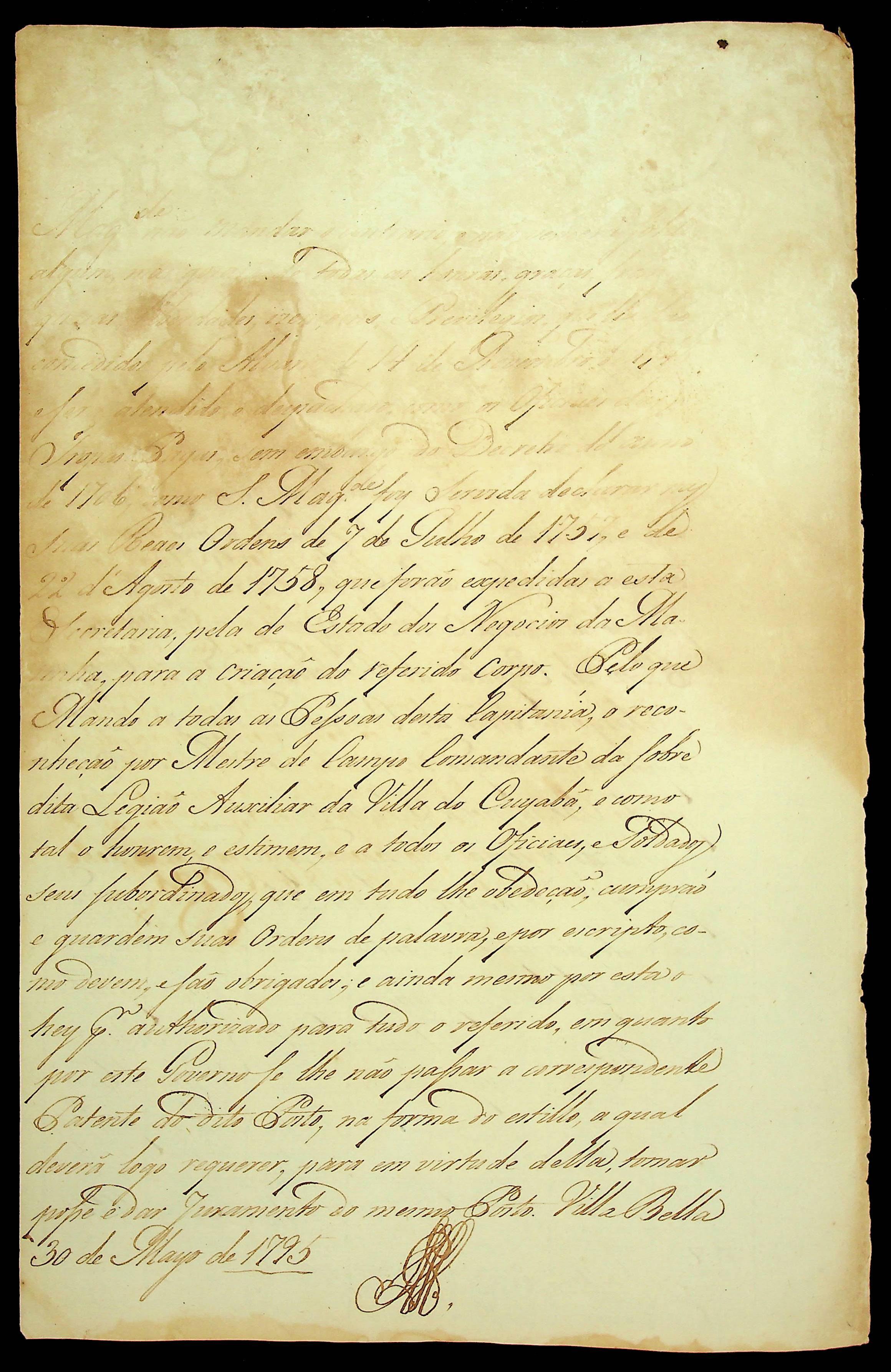 NOMEAÇÃO de José Paes Falcão das Neves para o posto de Mestre de Campo da Vila do Cuiabá, passada pelo [Governador e Capitão General da Capitania de Mato Grosso João de Albuquerque de Mello Pereira e Cáceres].