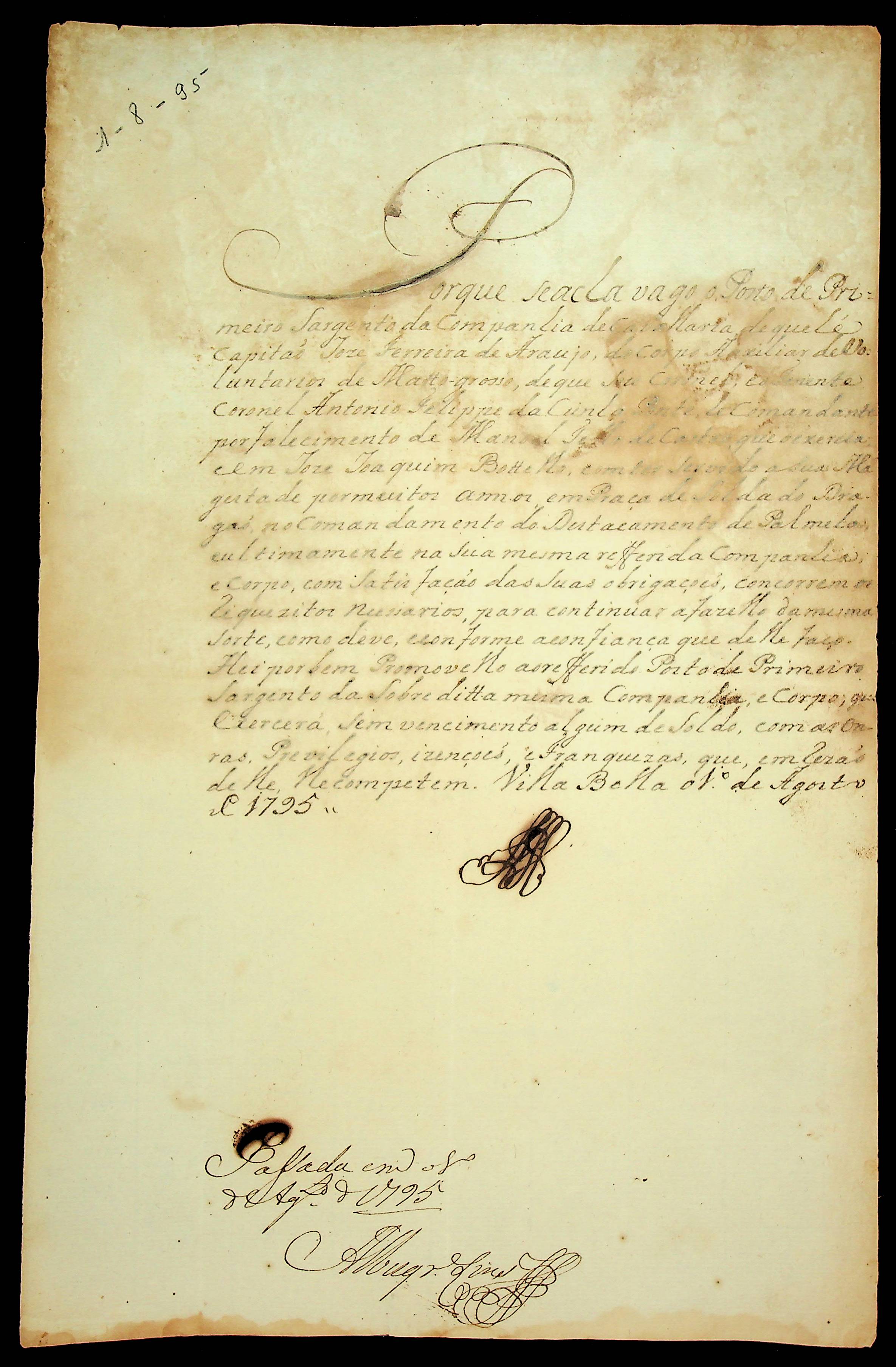 NOMEAÇÃO de José Joaquim Botelho ao cargo de primeiro Sargento da Capitania da Companhia de Cavalaria, passada pelo [Governador e Capitão General da Capitania de Mato Grosso João de Albuquerque de Mello Pereira e Cáceres].