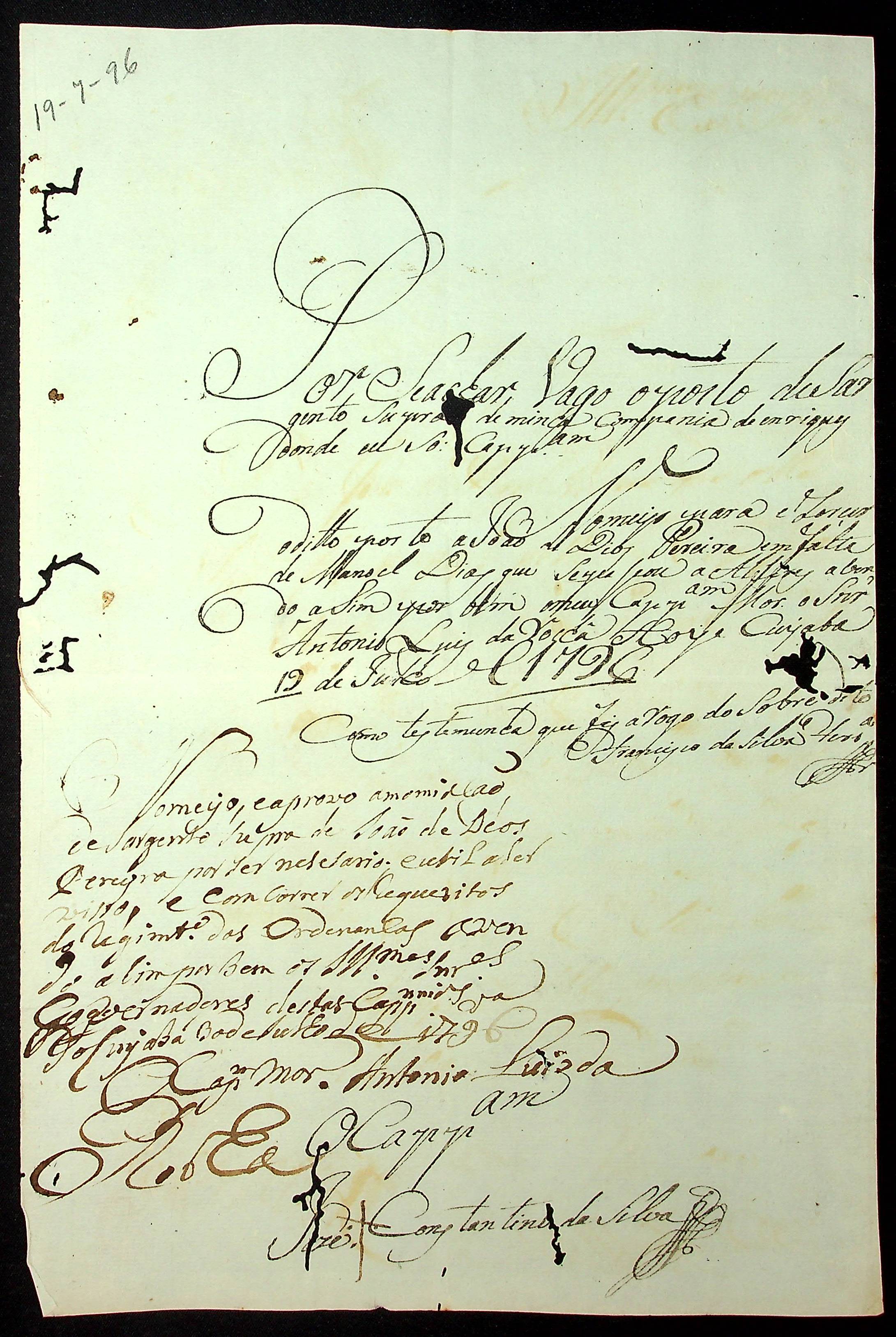 NOMEAÇÃO de João de [Dias] Pereira para o posto de Sargento da Companhia de Henriques, passada pelo Capitão José Constantino da Silva.