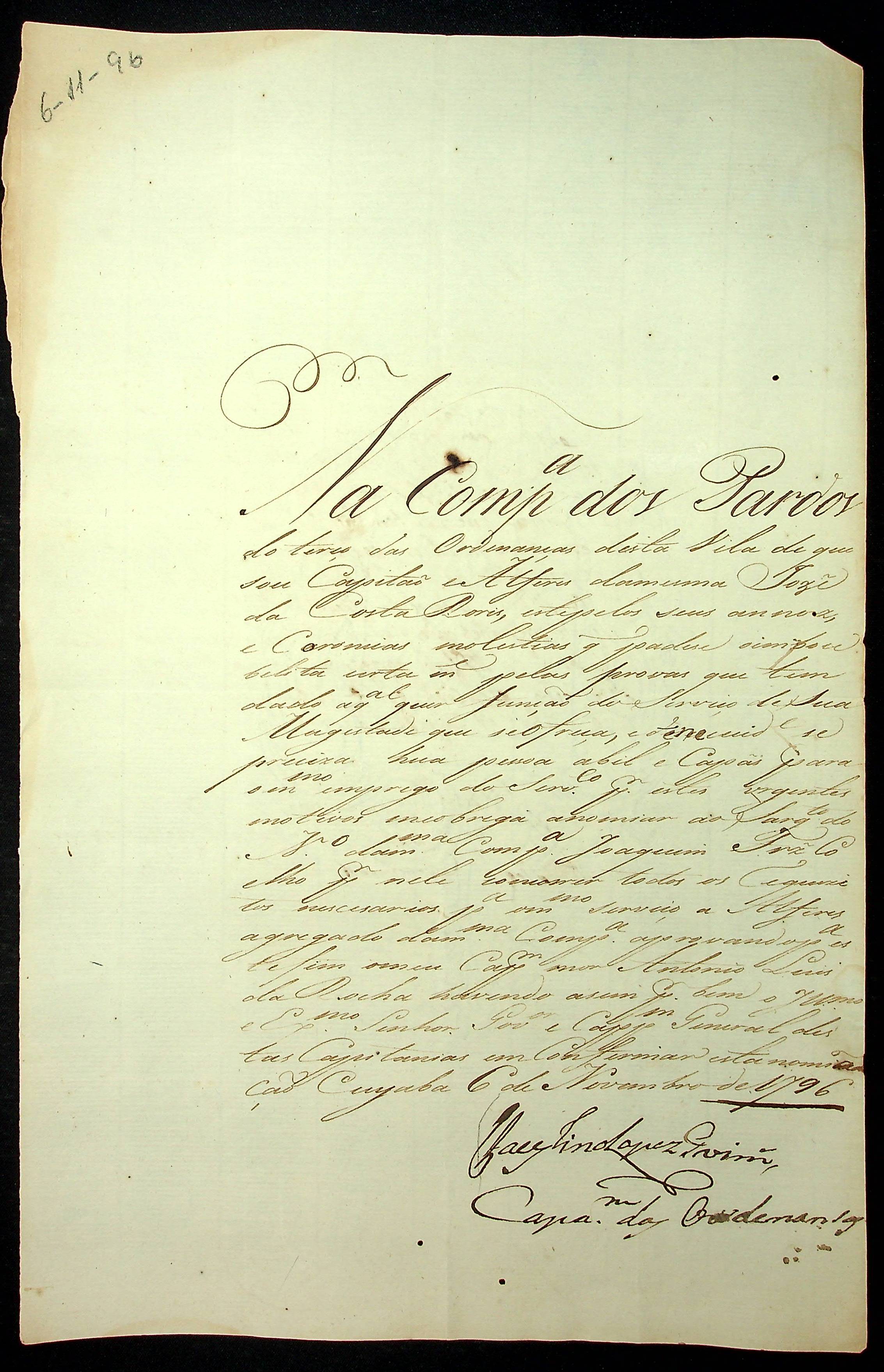 NOMEAÇÃO do Sargento Joaquim Fernandes Coelho ao posto de Alferes da Companhia dos Pardos do Terço das Ordenanças da Vila do Cuiabá, passada pelo Capitão de Ordenanças [...] Lopes [Guimarães].