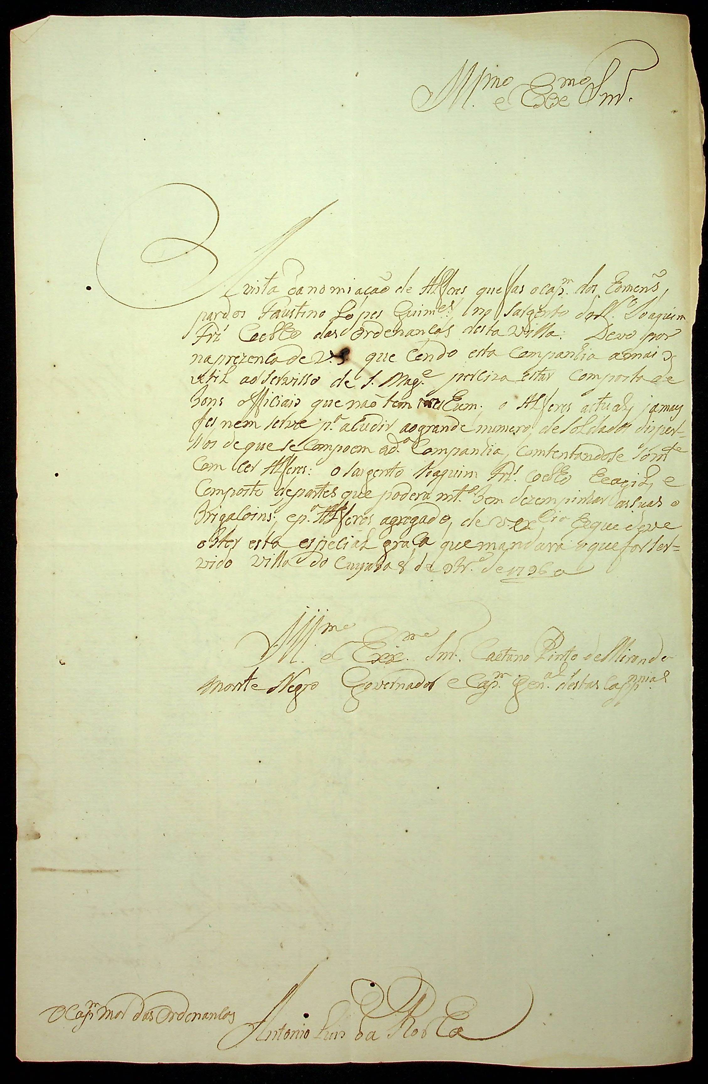 NOMEAÇÃO do Sargento Joaquim Fernandes Coelho ao posto de Alferes da Companhia dos Pardos do Terço das Ordenanças da Vila do Cuiabá, passada pelo Capitão de Ordenanças [...] Lopes [Guimarães].