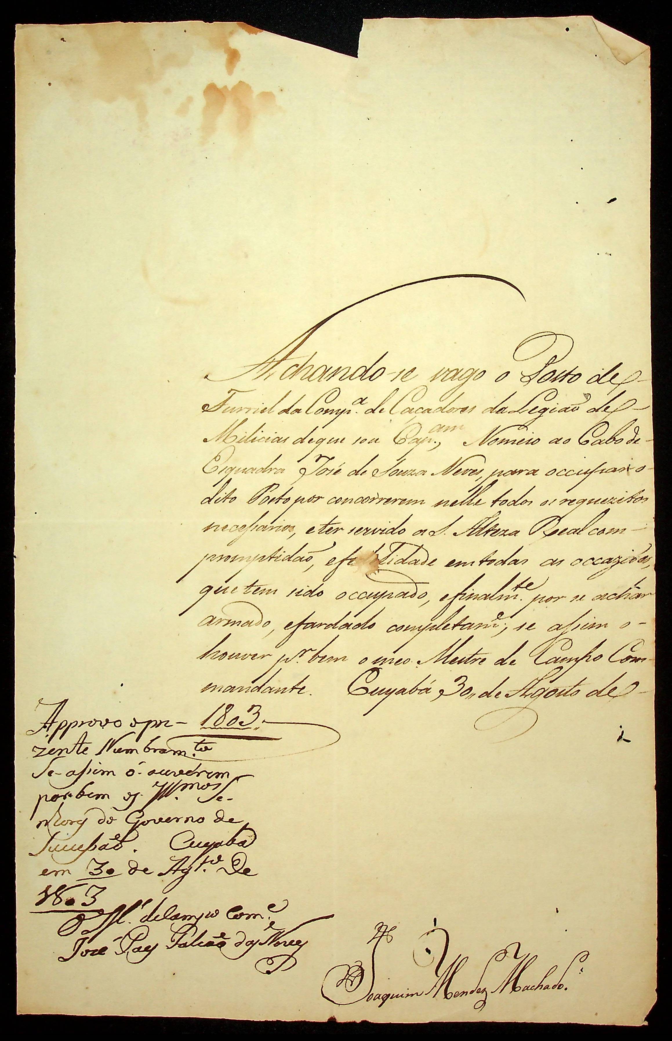 NOMEAÇÃO José de Souza Neves expedida por Joaquim Mendes Machado, ao posto de Furriel da Companhia de Caçadores da legião de Milícias.
