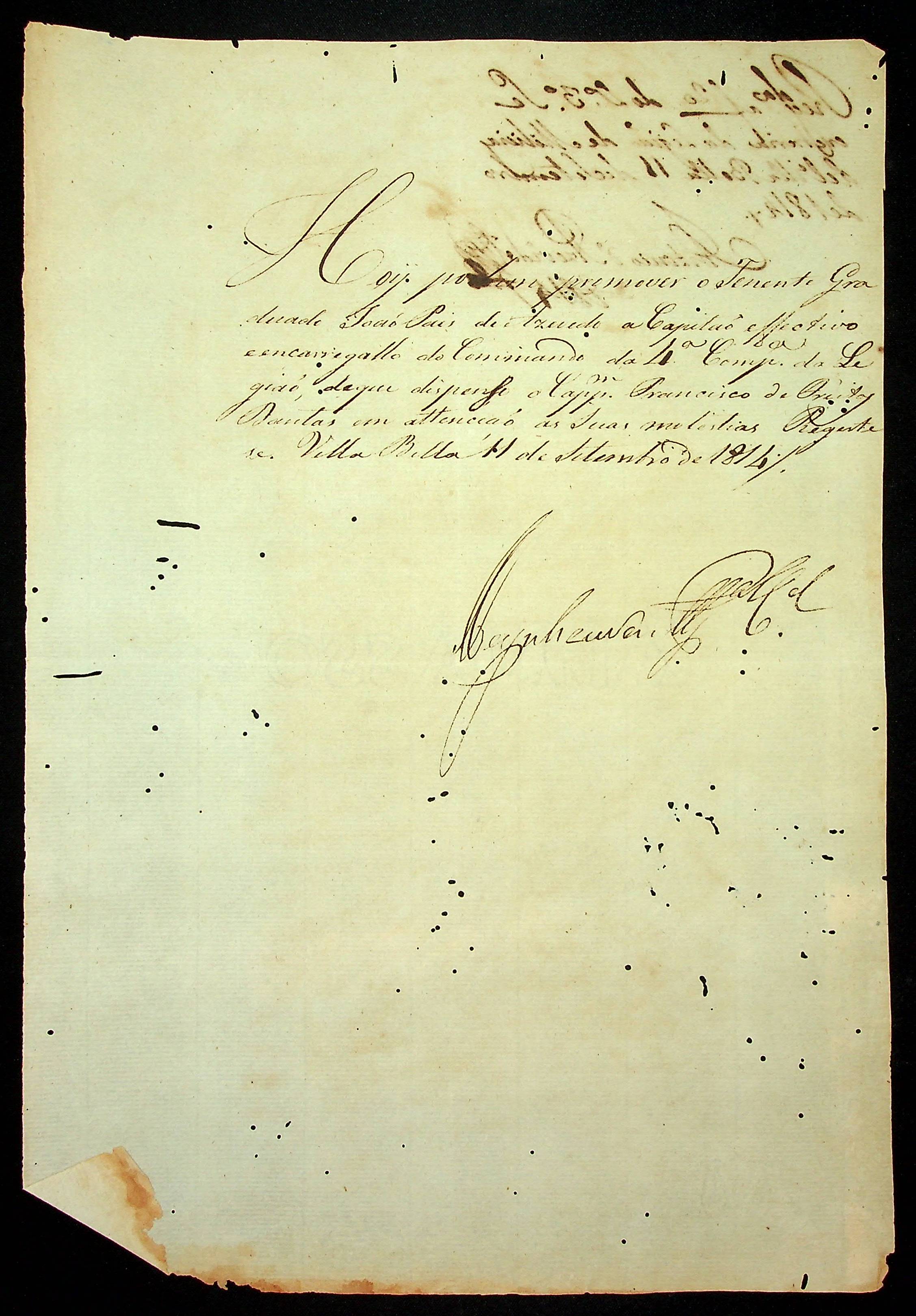 NOMEAÇÃO do Tenente João Paes de Azevedo ao posto de Capitão da 4ª Companhia da Legião passada pelo [Governador e Capitão-General da Capitania de Mato Grosso João Carlos Augusto D´Oeynhausen e Gravemberg].