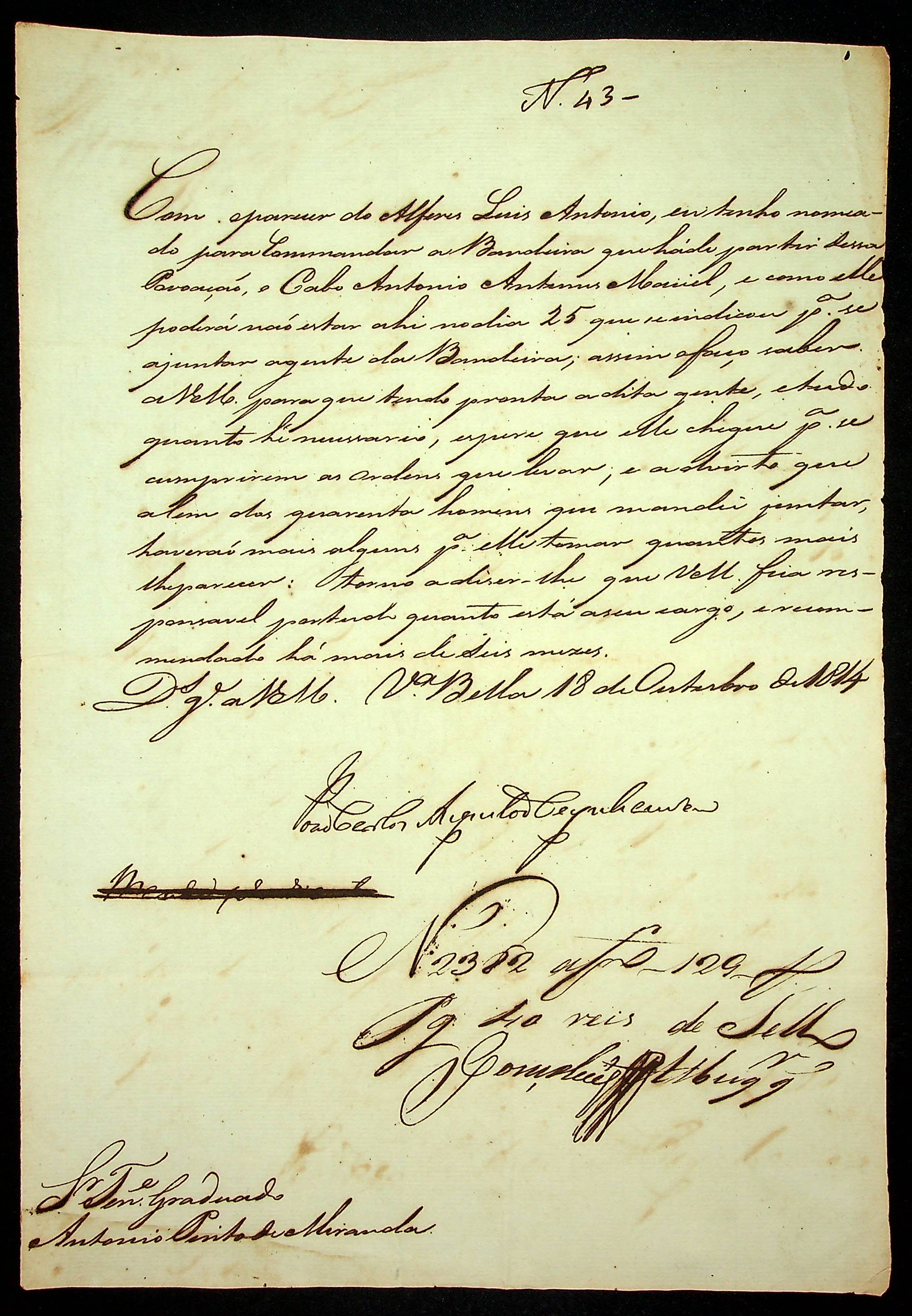 NOMEAÇÃO do Cabo Antônio Antunes Maciel ao Comando de uma Bandeira, passada pelo [Governador e Capitão-General da Capitania de Mato Grosso João Carlos Augusto D´Oeynhausen e Gravemberg]..