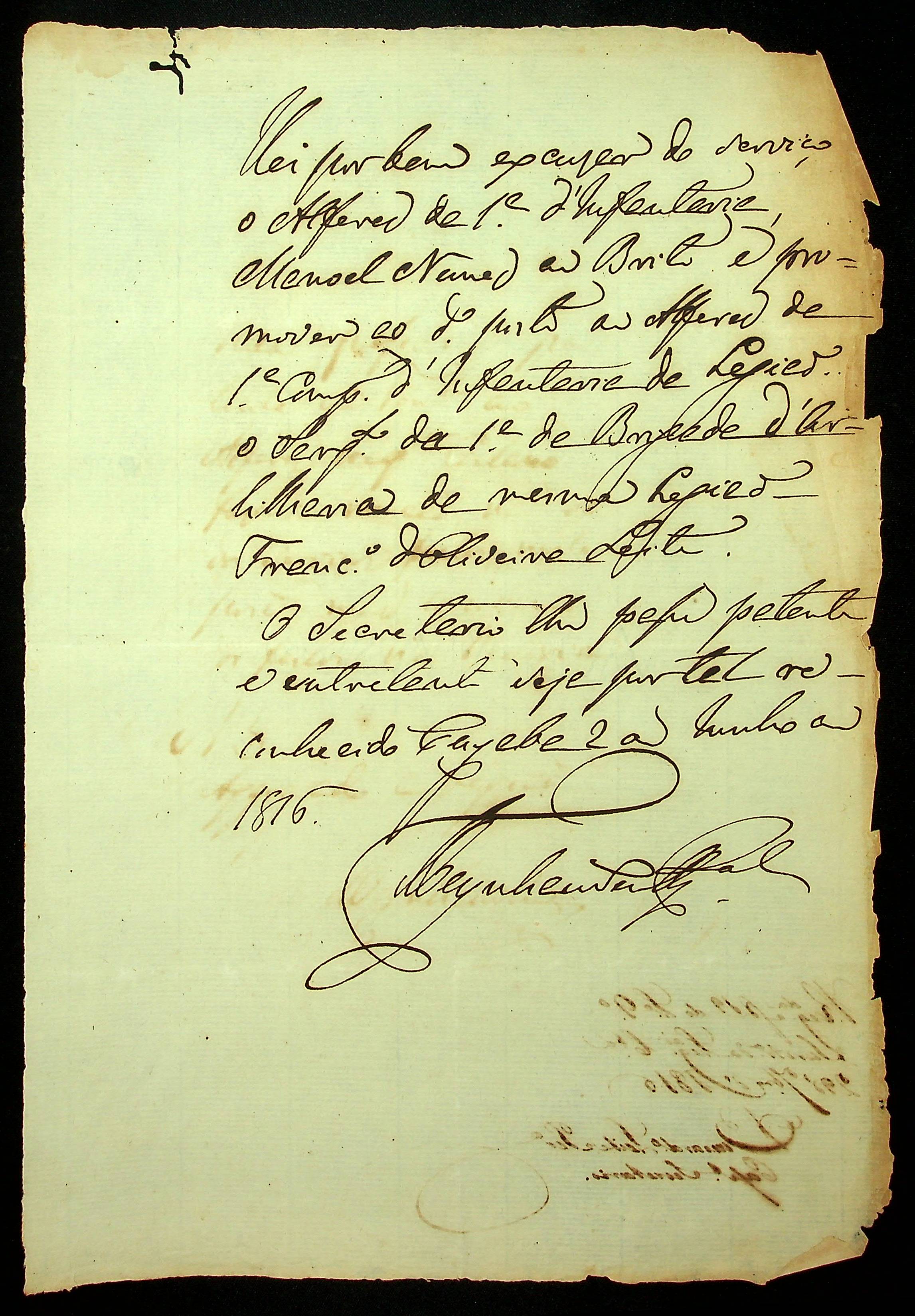 NOMEAÇÃO do Alferes da primeira infantaria Manoel Nunes de Brito ao posto de Sargento da primeira Brigada de Milicia, passada pelo [Governador e Capitão General da Capitania de Mato Grosso João Carlos Augusto de Oeynhausen e Gravemberg].