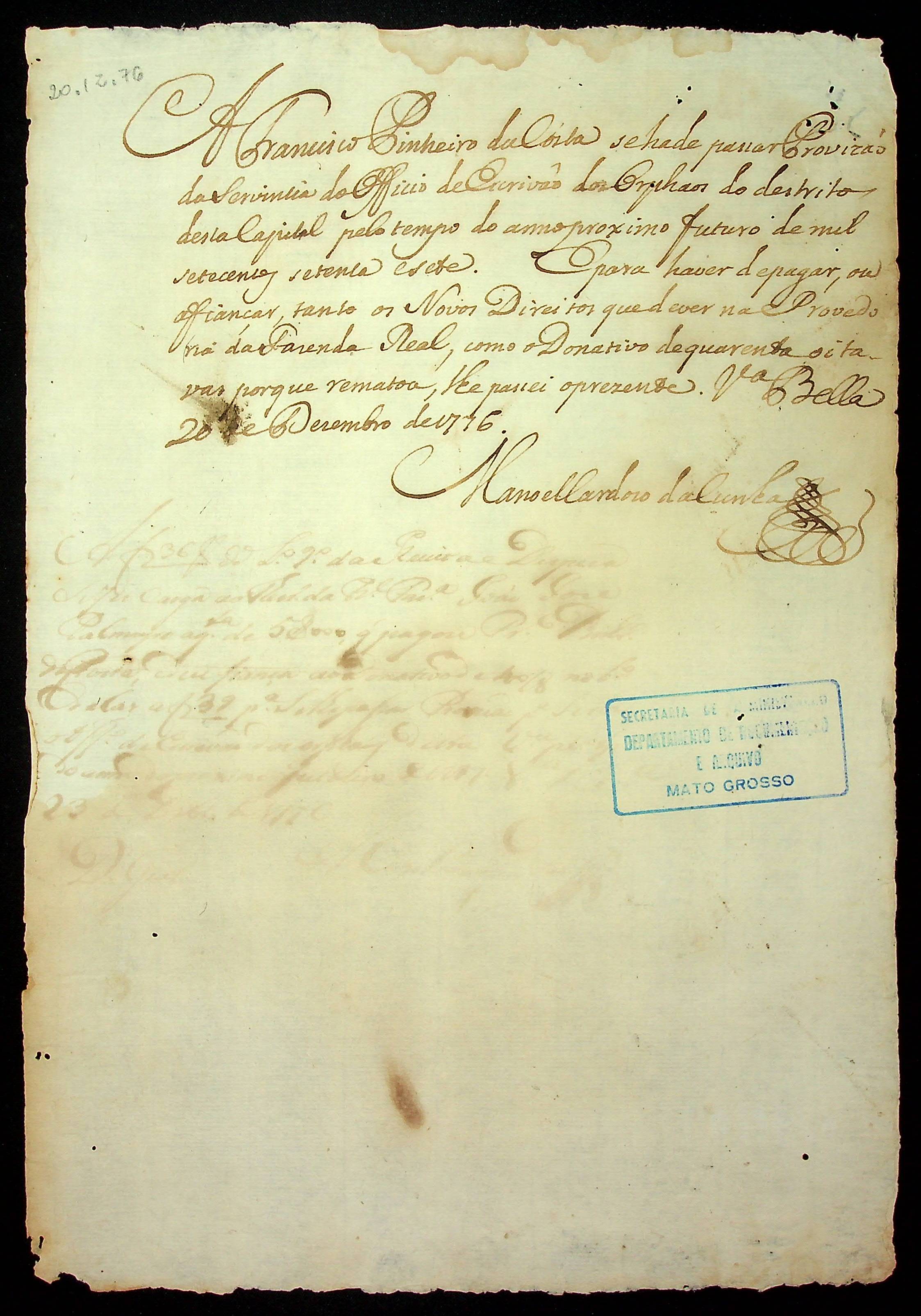 NOTICAÇÃO da [Secretário de Governo] Manoel Cardoso da Cunha á Francisco Pinheiro da Costa para pagar os direitos do Ofício de Escrivão dos Órfãos do Distrito da Capital.