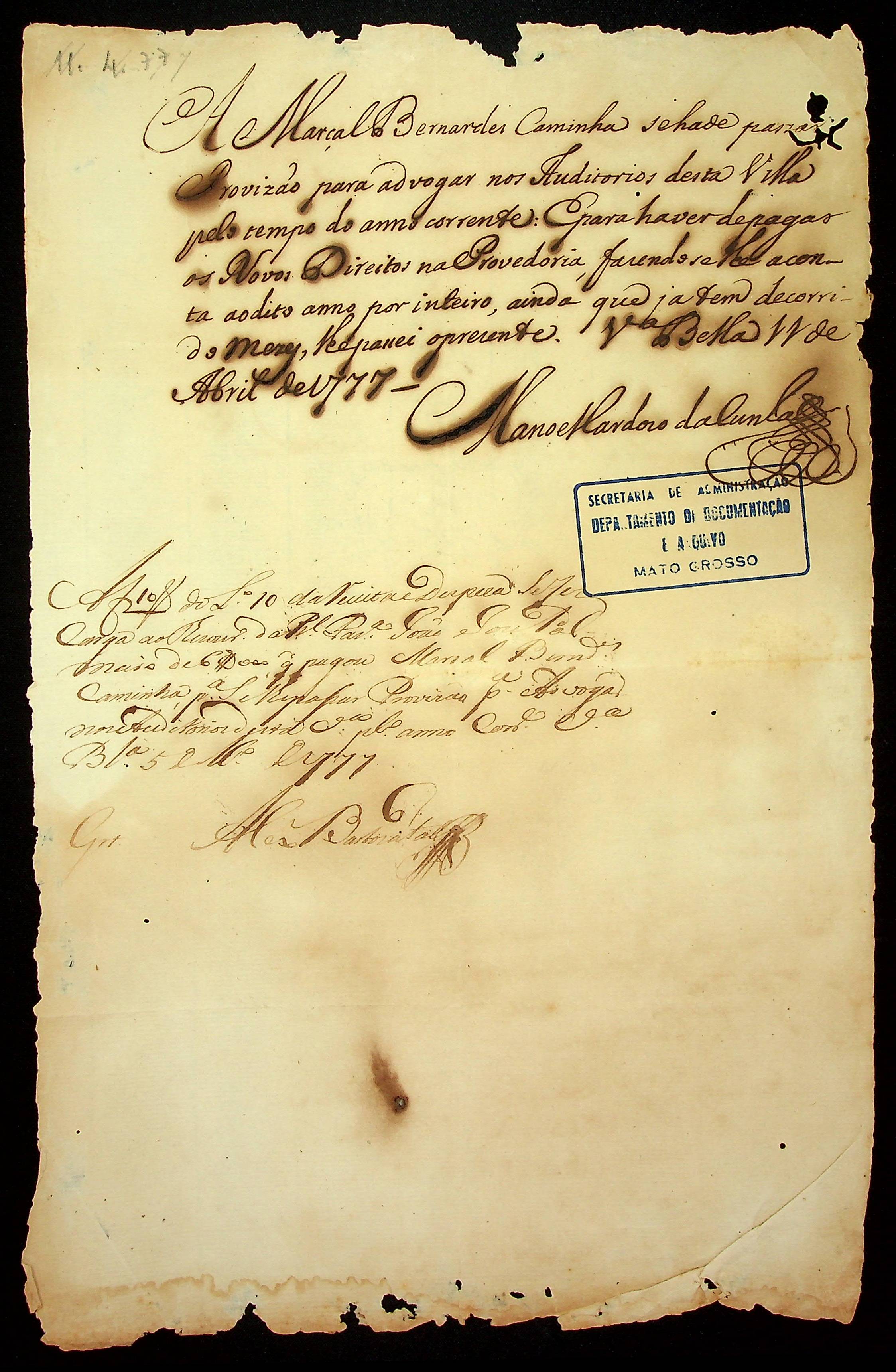 NOTIFICAÇÃO do Secretário de Governo Manoel Cardozo da Cunha a Marcel Bernardes Caminha para pagar os direitos de advogar nos auditórios de Vila Bela.