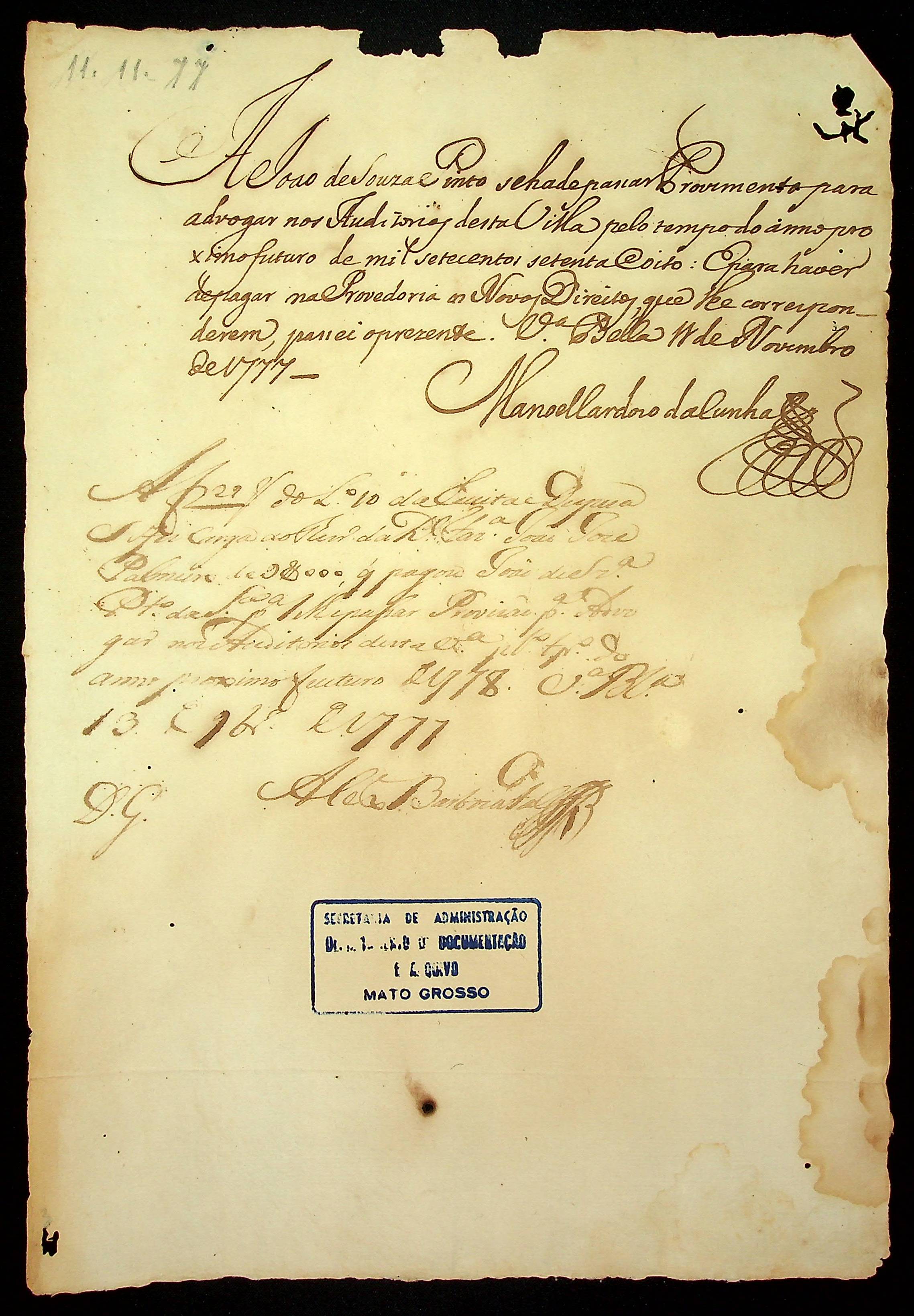 NOTIFICAÇÃO do Secretário de Governo Manoel Cardozo da Cunha a João de Souza e Pinto, para pagar os direitos de advogar nos auditórios da Vila do Cuiabá.