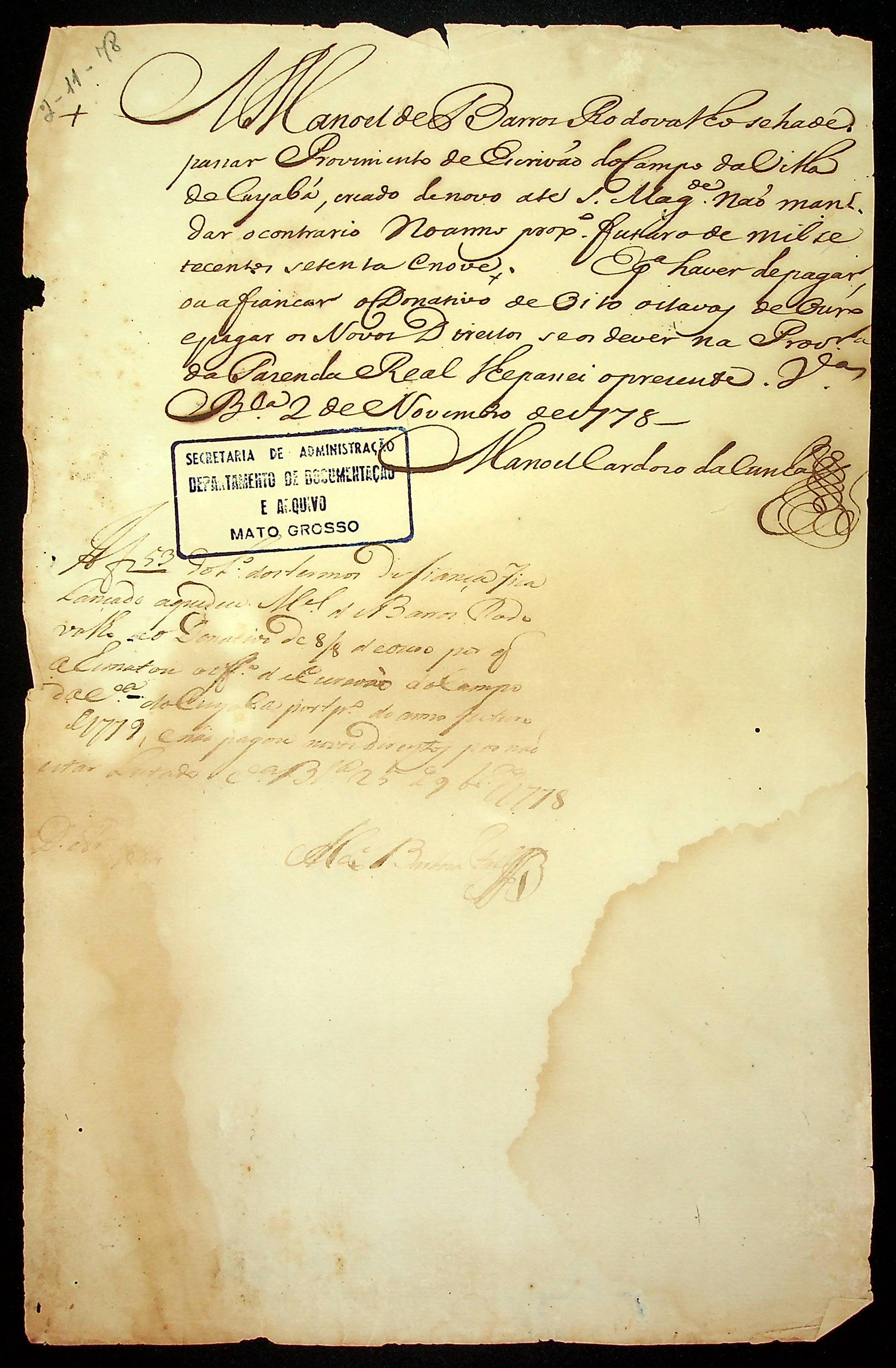NOTIFICAÇÃO do Secretário de Governo Manoel Cardozo da Cunha a Manoel de Barros Rodovalho, para pagar donativo do provimento de Escrivão do Campo da Vila do Cuiabá.