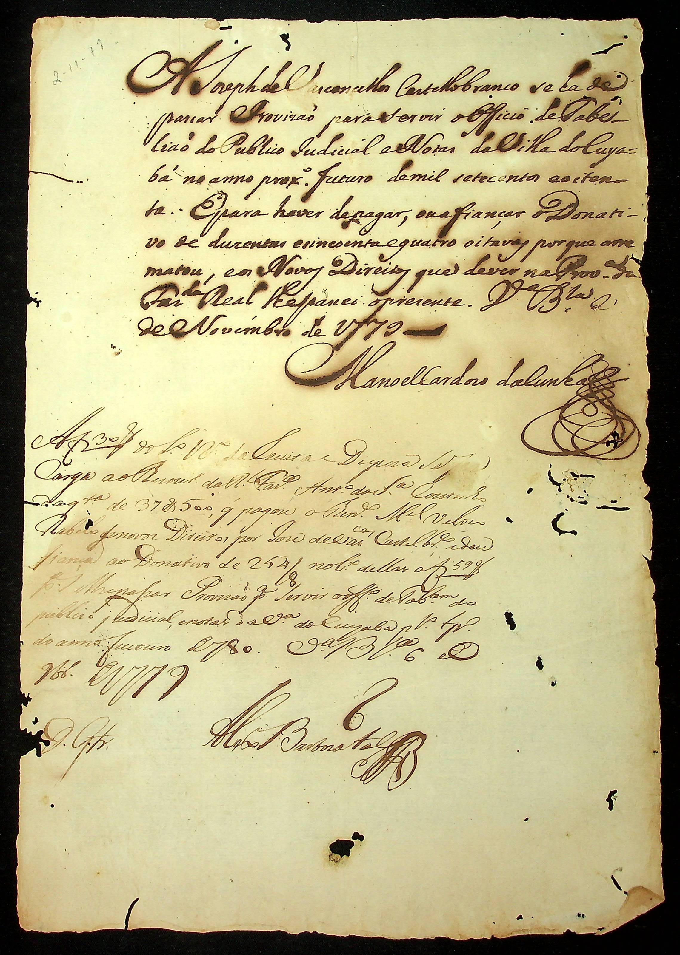NOTIFICAÇÃO do Secretário de Governo Manoel Cardoso da Cunha que Joseph de Vasconcelos Castelo Branco para pagar pelo direito de exercer o ofício de Tabelião do Público Judicial e Notas.