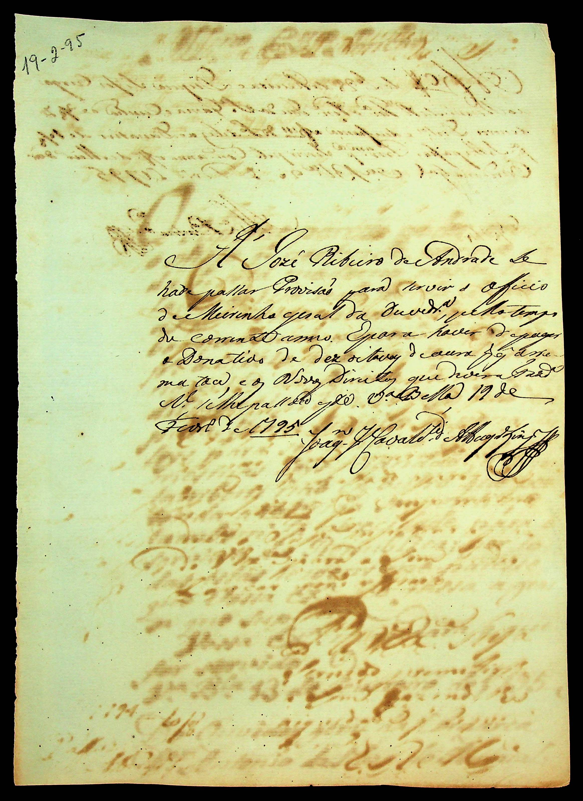 NOTIFICAÇÃO feita pelo Secretário do Governo Joaquim Cavalcante Albuquerque Lins á José Ribeiro de Andrade, para pagamento de direitos do cargo de meirinho da ouvidoria.