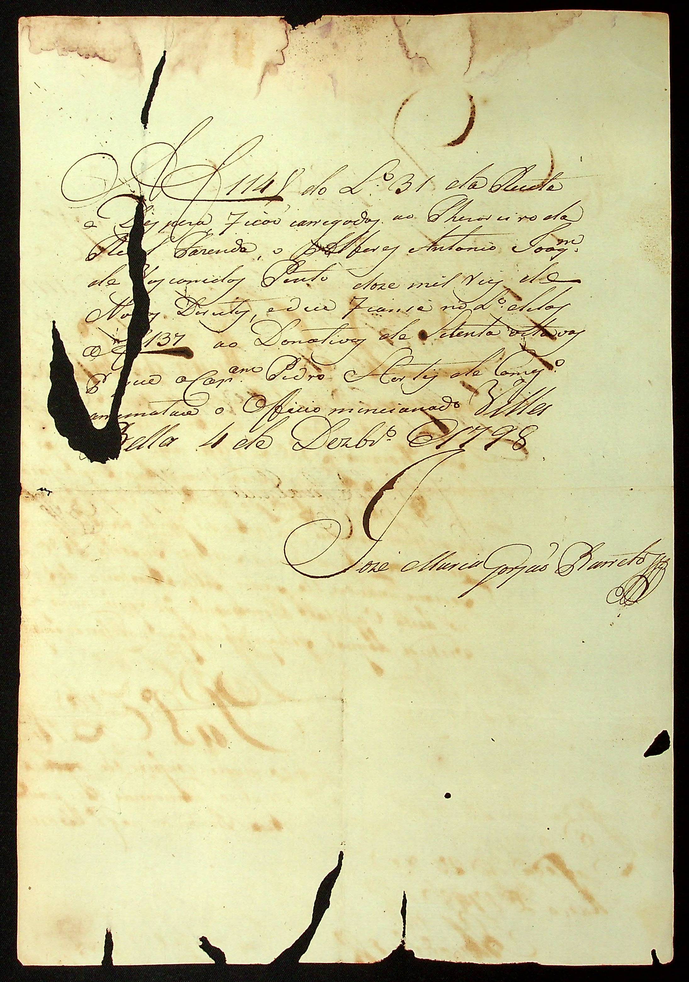 NOTIFICAÇÃO feita pelo [Secretário de Governo] Joaquim José Cavalcante de Albuquerque Lins ao Capitão Pedro Ortiz de Camargo para o pagamento de Novos Direitos para servir o ofício de Escrivão da Câmara e Almotaçaria de Vila Bela.
