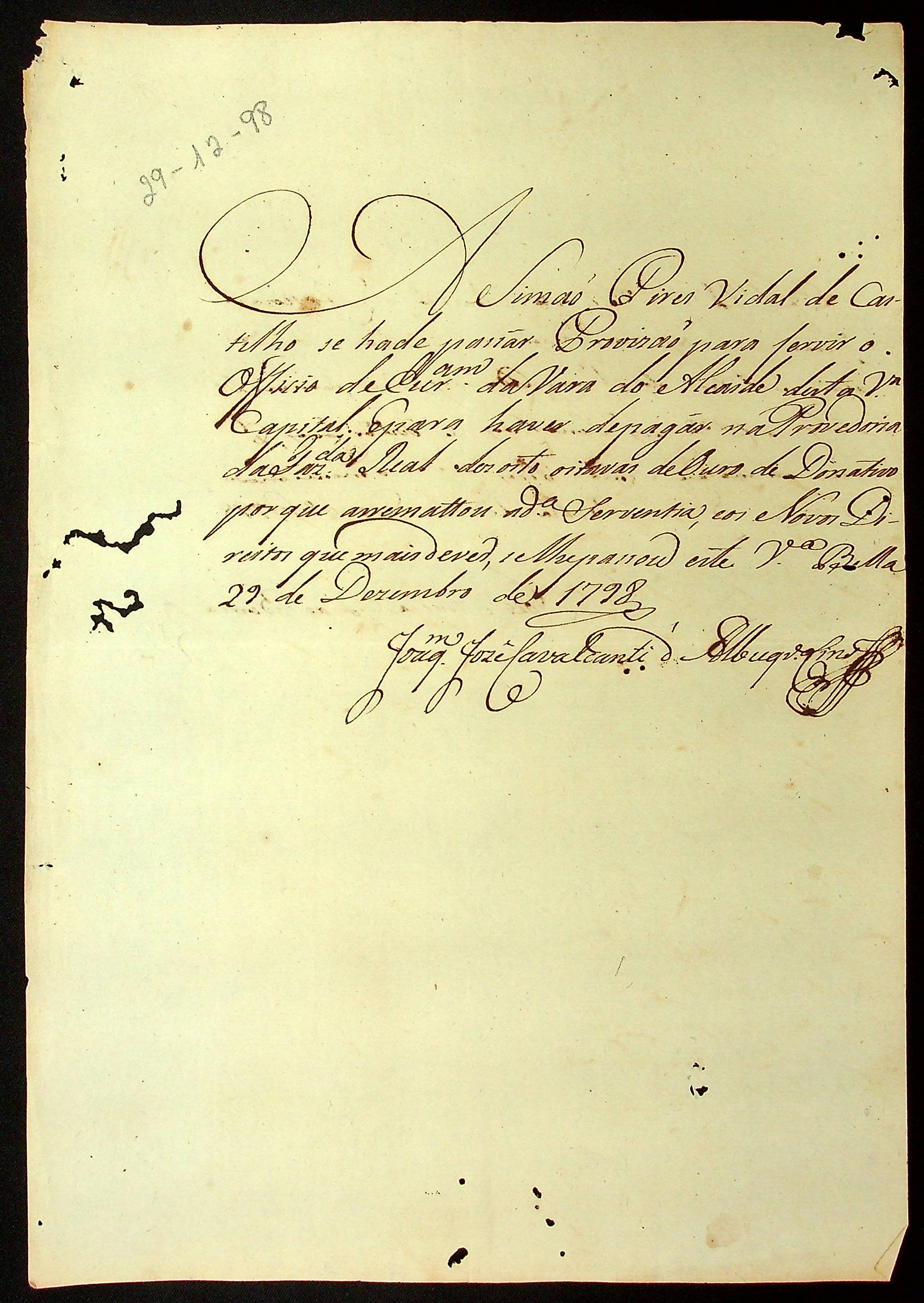NOTIFICAÇÃO feita pelo Secretário de Governo Joaquim José Cavalcante de Albuquerque Lins á Simão Pires Vidal de Castilho para o pagamento de novos direitos para servir o ofício de Escrivão da Vara do Alcaide de Vila Bela.