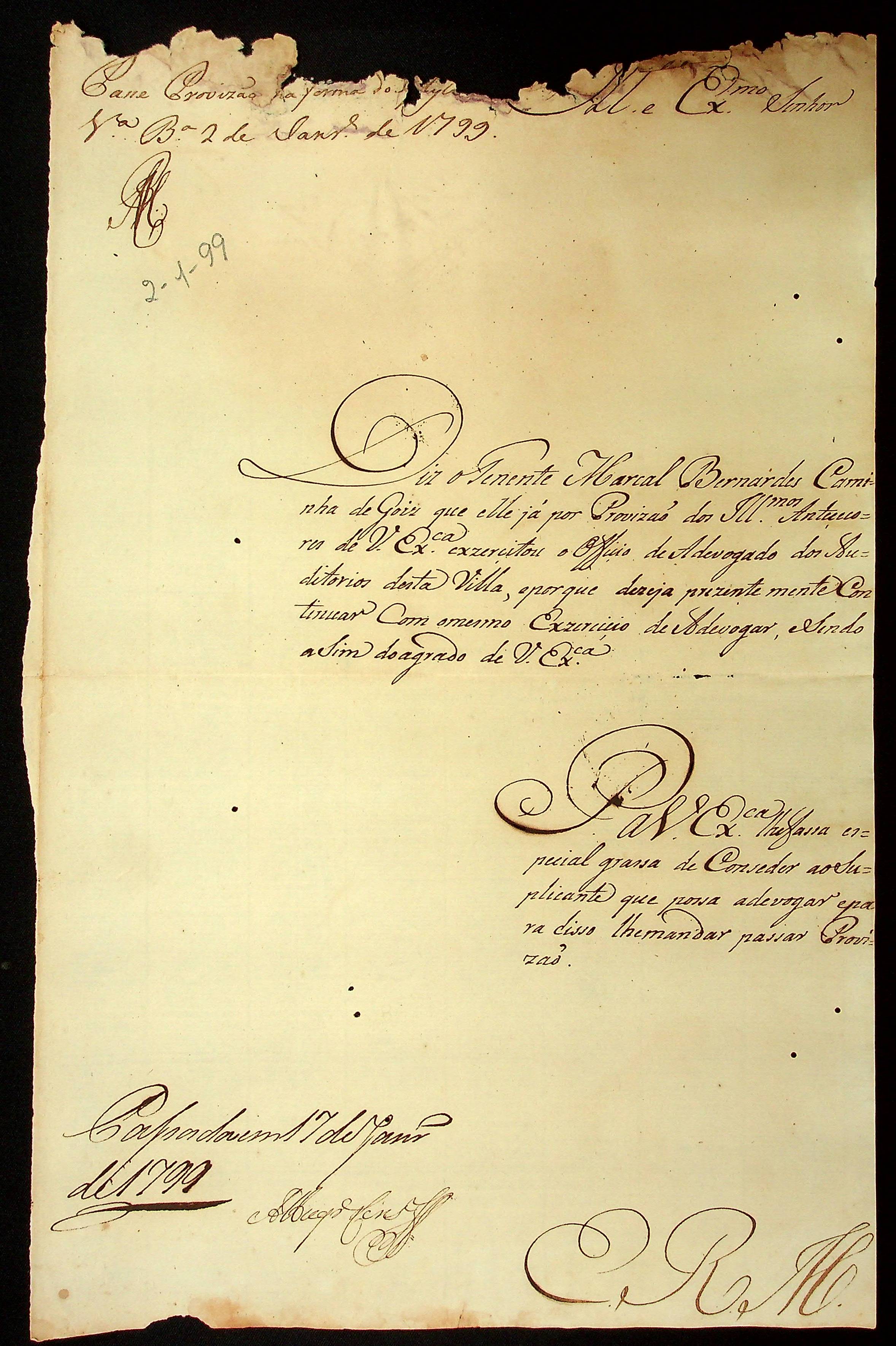 NOTIFICAÇÃO feita pelo Secretário de Governo Joaquim José Cavalcante de Albuquerque Lins ao Tenente Marçal Bernardes Caminha de Góes para o pagamento de novos direitos para advogar nos Auditórios de Vila Bela.