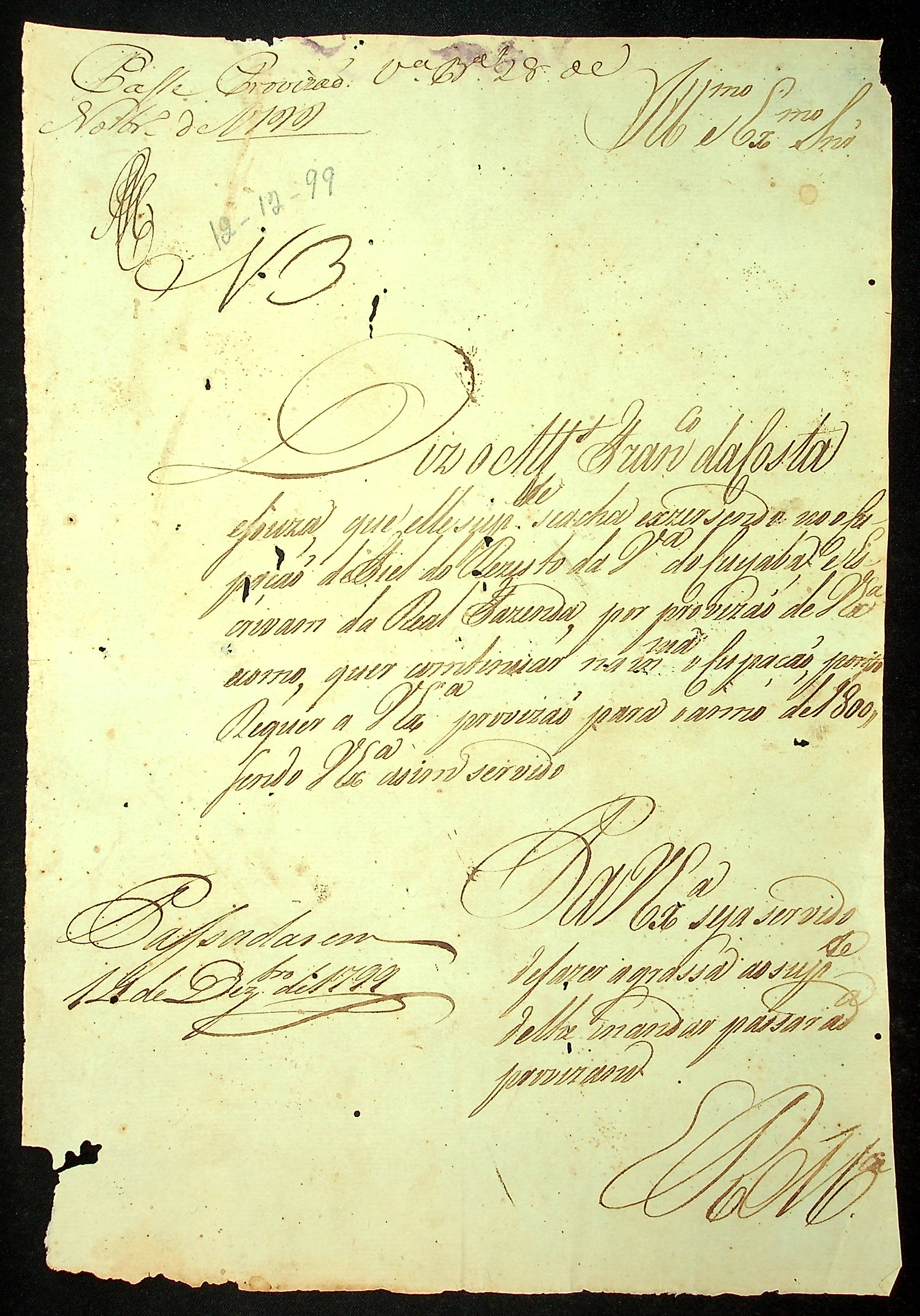 NOTIFICAÇÃO feita pelo [Secretário de Governo] Joaquim José Cavalcante de Albuquerque Lins para Francisco da Costa e Souza para pagamento dos novos direitos e assim receber a Provisão para servir o ofício de Escrivão da Câmara e de Almotaçaria da Vila do Cuiabá.