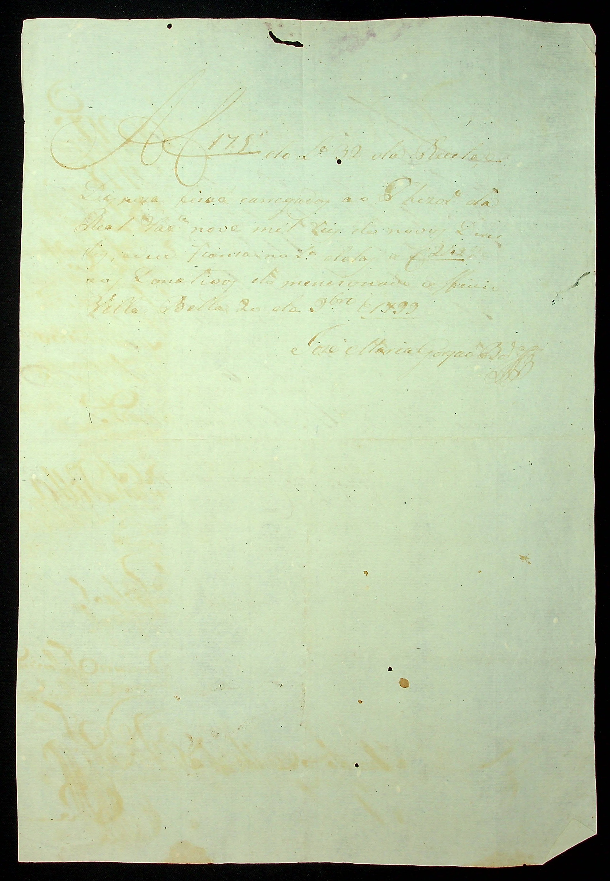 NOTIFICAÇÃO feita pelo [Secretário de Governo] Joaquim José Cavalcante de Albuquerque Lins para João Antônio Soares para pagamento dos novos direitos e assim receber a Provisão para servir o ofício de Escrivão de Órfãos e da Guarmoria da Vila do Cuiabá.