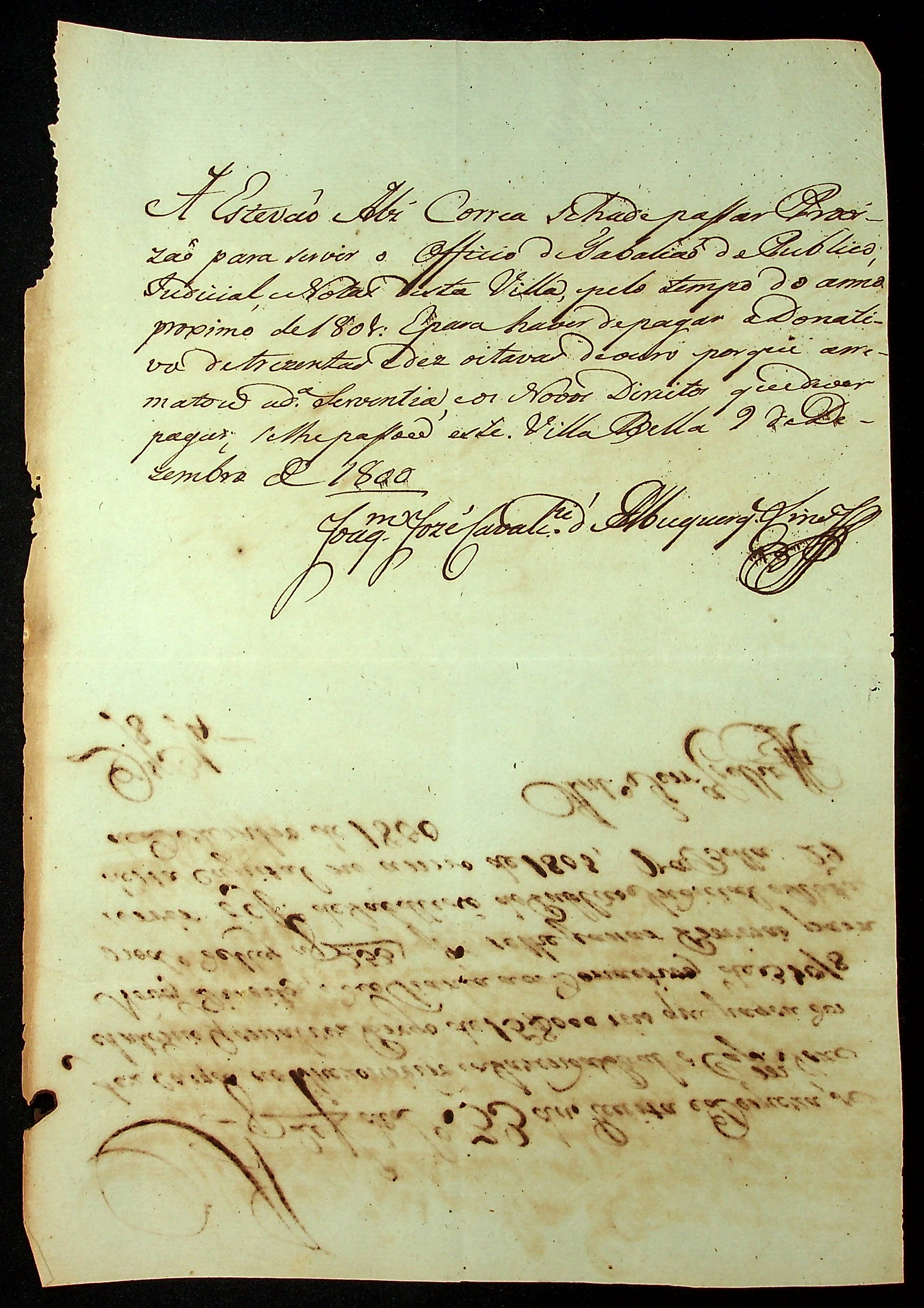 NOTIFICAÇÃO feita pelo [Secretário de Governo] Joaquim José Cavalcante de Albuquerque Lins á Estevão Alves Correa para pagamento de novos direitos e assim receber provisão para servir o ofício de tabelião do público Judicial e notas de [Vila Bela].