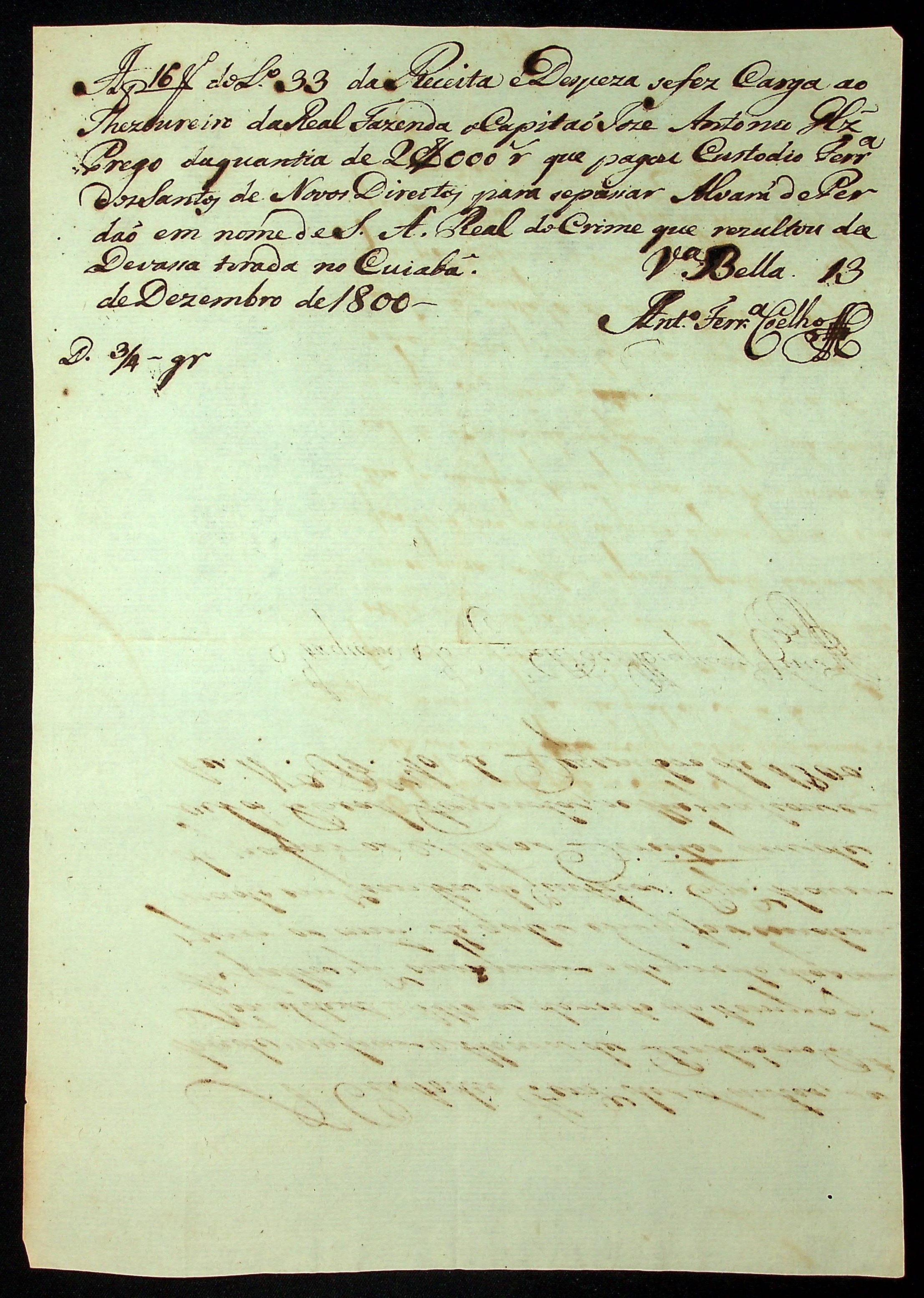 NOTIFICAÇÃO feita pelo [Secretário de Governo] Joaquim José Cavalcante de Albuquerque Lins á Custódio Ferreira dos Santos para pagamento de novos direitos e assim receber alvará de perdão.