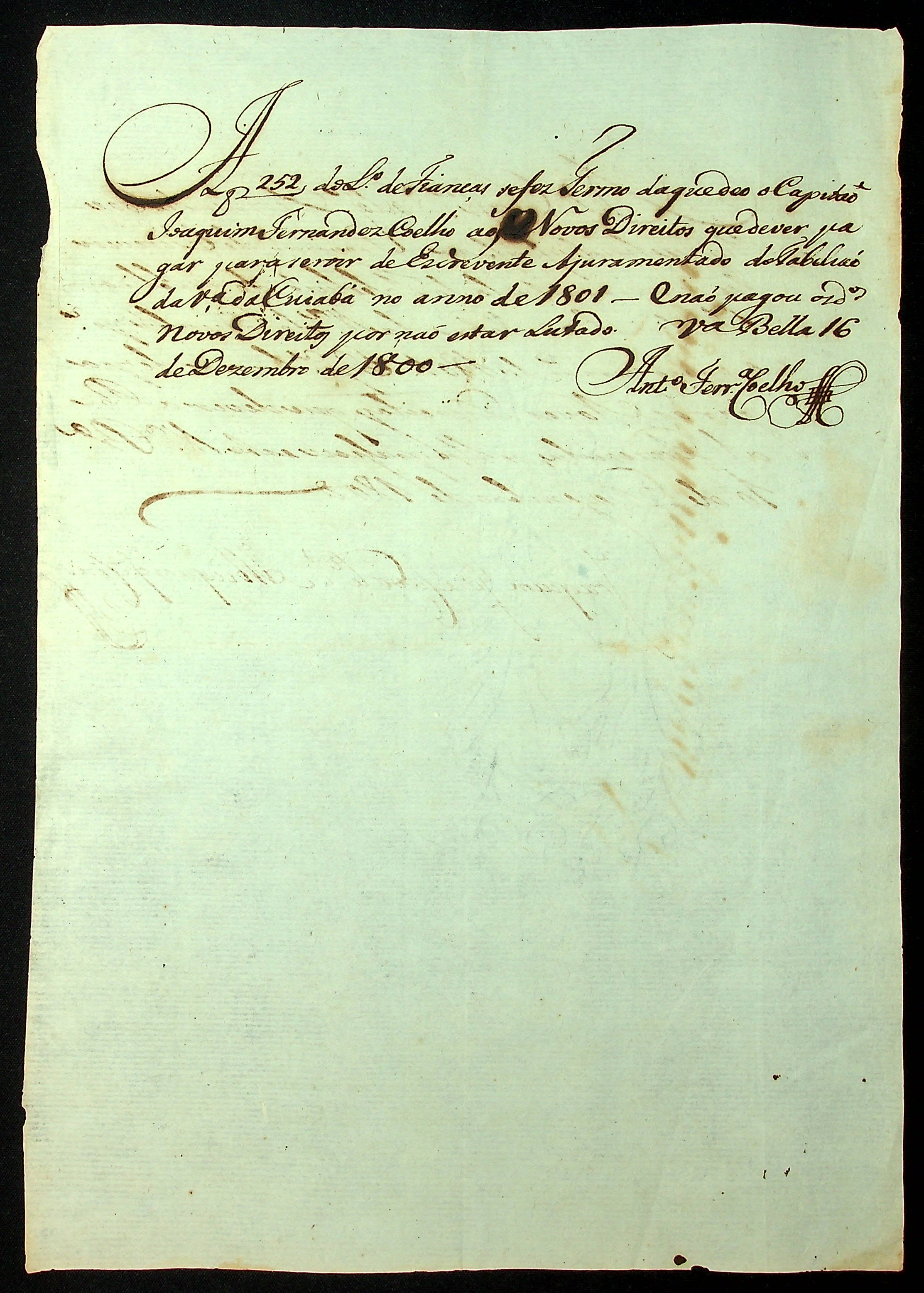 NOTIFICAÇÃO feita pelo [Secretário de Governo] Joaquim José Cavalcante de Albuquerque Lins á Joaquim Fernandes Coelho para pagamento de novos direitos e assim receber provisão de escrevente juramentado do tabelião do público judicial e notas da Vila do Cuiabá.